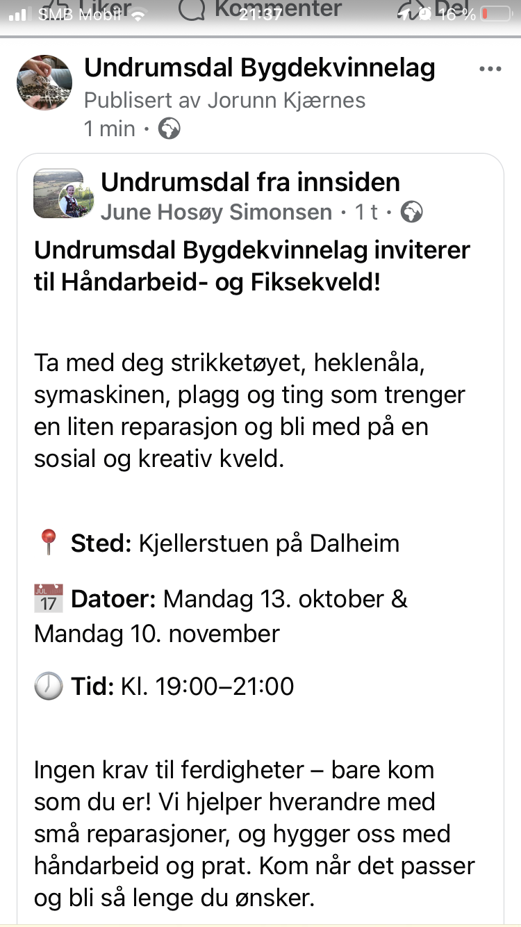 Forside Om oss Previous Next Håndarbeid og fiksekveld Se Facebook. Eller kontakt Jorunn91311657 Undrumsdal Superbruker · 06. oktober, 2025 Like 182 Del på: