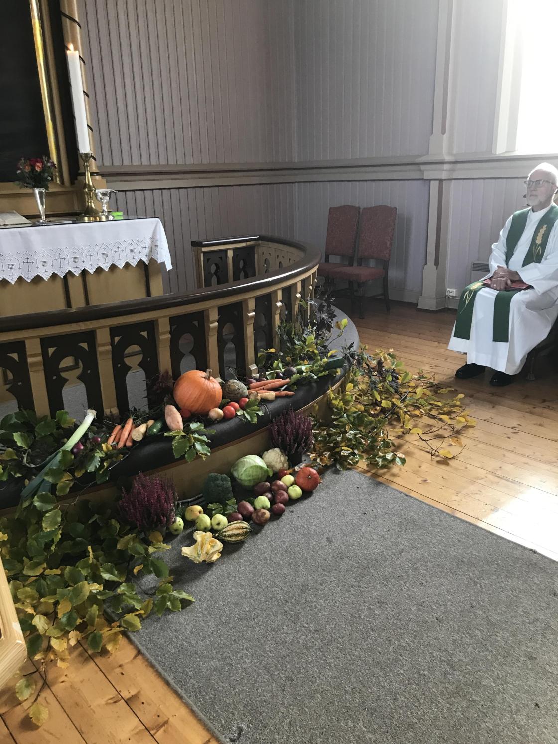 Det var pyntet til Høsttakkegudstjeneste i kirken i dag. Karin (og Kjell) Haughem hadde pyntet på vegne av Undrumsdal bygdekvinnelag.