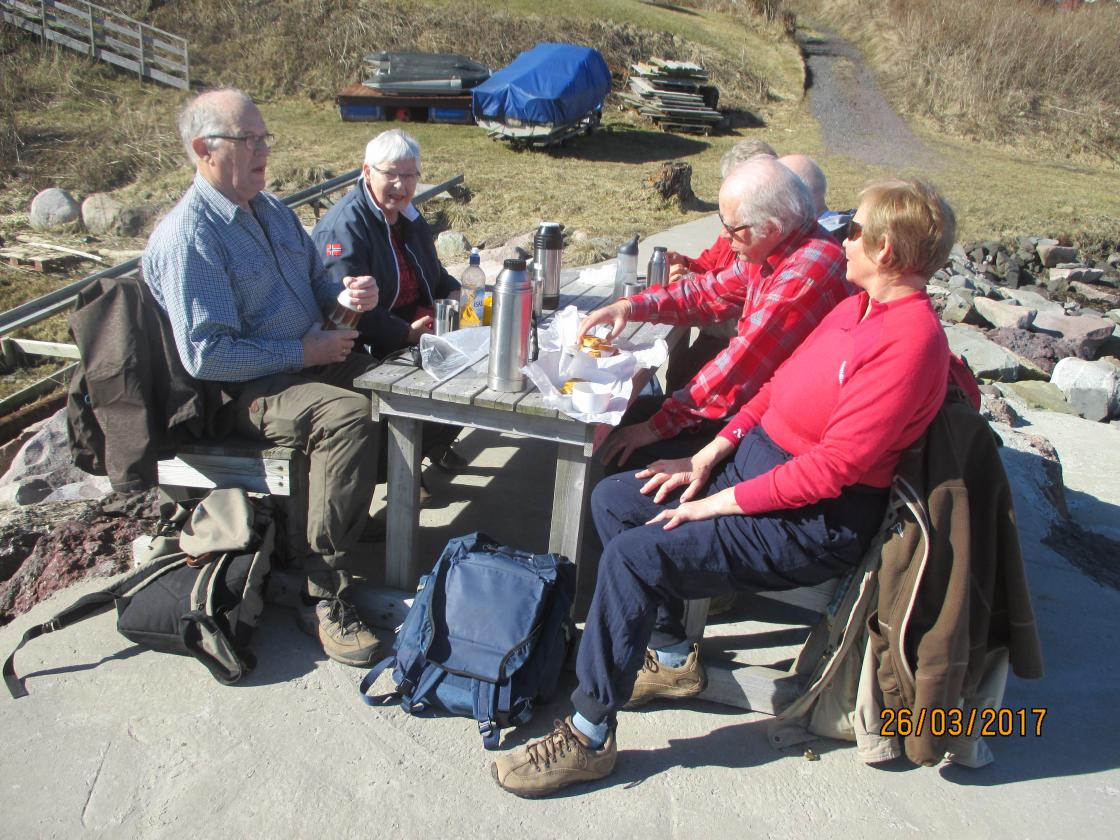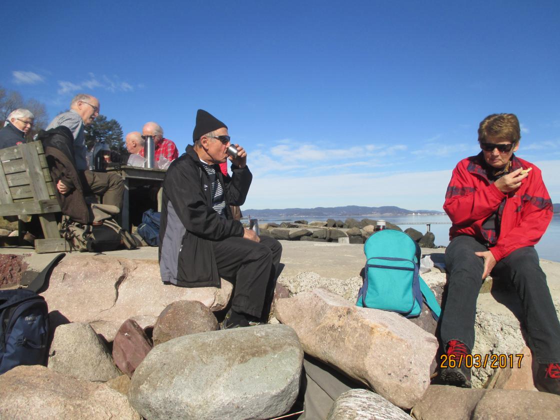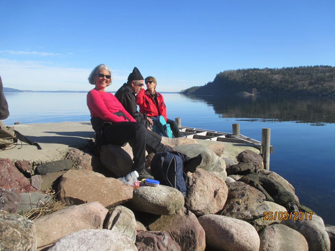 Etter en hyggelig pause her gikk turen videre på sti/grusveg. Vi gikk ned til vannet ved et skilt merket "Badeplass". Det ble ikke bading, men en fin tur sørover langs stranda - helt til vi kom til en fin steinbrygge der vi tok oss en velfortjent medbrakt lunsj. Vi nøt solen og varmen, niste og kaffe og praten gikk livlig før vi ruslet videre sørover. Vi møtte en kar som fortalte hvor vi måtte gå opp for å komme til bilparkeringa - så turen ble ikke så lang, men vi måtte jo nyte den flott dagen i solen!.