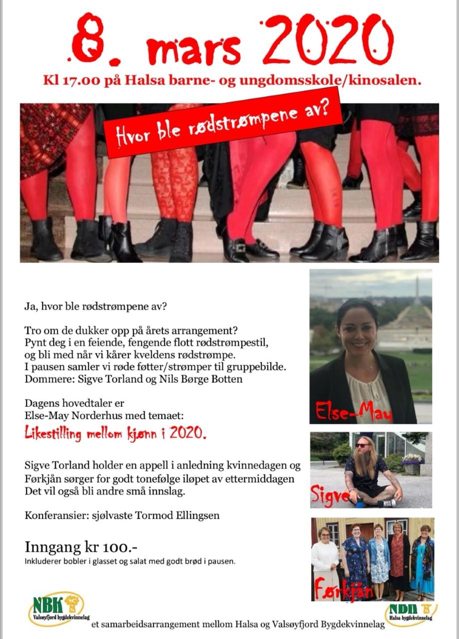 Bygdekvinnelagene i Halsa (Valsøyfjord og Halsa) har i mange år vært arrangør av ei 8. mars tilstelning av forskjellig slag. I år har vi fått hit vår egen stortingspolitiker Else-May Botten Norderhus som arrangementets hovedtaler. Hun vil snakke om «Likestilling mellom kjønnene i 2020». Rektor ved Halsa barne- og ungdomsskole Sigve Torland vil holde en appell for dagen. I tillegg vil det bli fin sang både fra Førkjån og Nils Børge Botten- og litt anna program.