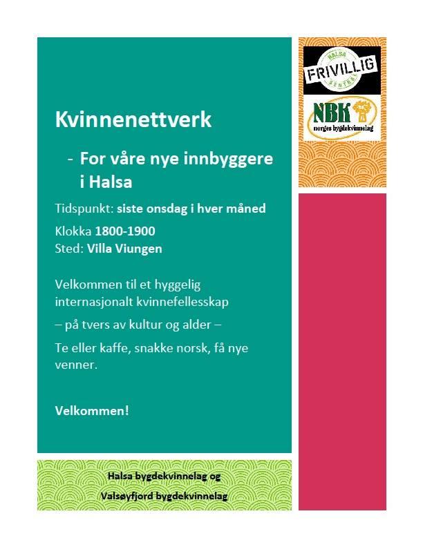 Valsøyfjord bygdekvinnelag og Halsa Bygdekvinnelag satser i vår på å etablere et internasjonalt kvinnenettverk/kvinnegruppe i Halsa. Vi ser for oss at dette skal være en aktiv møteplass hvor vi gjør ting ilag. Hvor vi viser fram vår kultur- og lærer av deres. Snakker sammen. Lærer språket. Blir kjente med hverandre.