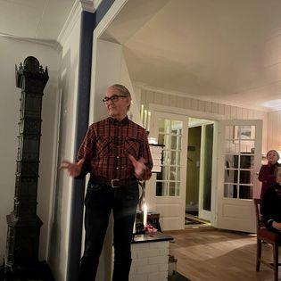 Denne kvelden fikk vi flere innslag, først fra Vigdis som fortalte om gården og dens historie langt langt tilbake i tid. Her er det gjort flere arkeologiske funn fra ulike tidsepoker og Even viste frem noen av funnene han selv hadde gjort. Videre fortalte Even oss om bevere i elva nedenfor.