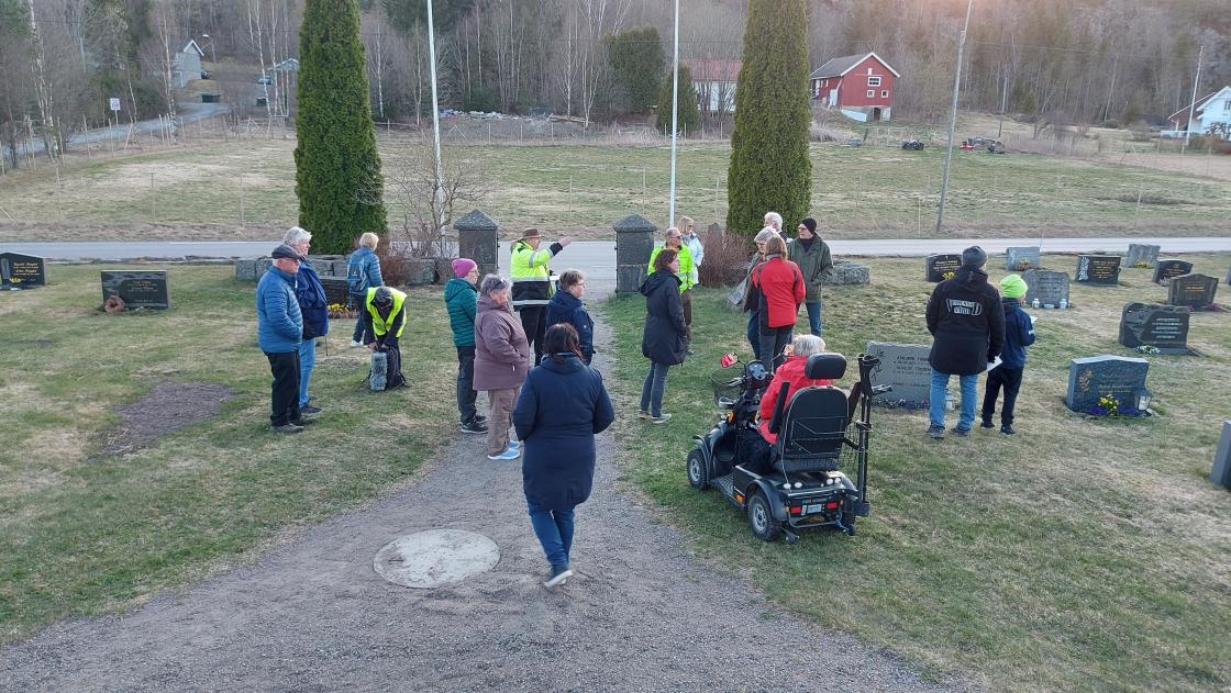 Vi fikk en god gjennomgang av følgende: • Veier og veisystemer. Det har fra gammelt av vært mange veier både nordover, sydover, østover og vestover og vi fikk beskrevet de forskjellige veiene/stiene. • Kirken. Vifilstadir stavkirke er omtalt i Biskop Eysteins jordebok fra 1390. Denne ble erstattet av tømmerkirke fra 1628. Kirken brant i 1911 og ble bygd opp igjen og innviet i 1914 (dagens kirke). Av interiør i kirken kan nevnes altertavle og prekestol fra 1667. Kilden var synlig på 1700 tallet og lå på kirkens søndre, vestre side. Folk valfartet til kirken/kilden på den tiden og ga gaver for tilgivelse og helbredelse. Etter reformasjonen i 1537 var dette egentlig ulovlig og det ble slutt på det på 1700 tallet. • Vivestad skole. Skolen ble flyttet etter kirkebrannen og oppført i 1912 til der den ligger i dag. • Butikken som inneholdt butikk, post og sentral. Butikkdrift fra 1890 tallet fram til 1988. • Vivestad poståpneri. Posten ble nedlagt i 1990. • Byggefeltet Kirkeåsveien hvor det ble startet å bygge i 1976. • Badstua ble oppført i 1947 eid av Vivestad sanitetsforening og Vivestad ungdomslag – nå eies av ungdomslaget, men driftes av eget styre. • Gamle fotballbanen ble innviet i 1953. Ikke benyttet siden 1992. • Ysteriet ble etablert i 1879 og produserte fetost og mysost. Nedlagt ca 1930. Senere ble det leiligheter der. Bygget brant i 2003 og ikke senere gjenoppbygd. • Butikk på Skjønsberg. Ble drevet som butikk fram til 1958. Eiendommen er nå bolighus. • Sentralen. Telefonsentral fra 1909 til 1975. • Vallumrøds verksted fra 1939. Ble drevet som verksted og bensinstasjon og knottfabrikk under krigen. Nå inneholder bygningen Glasshytta i Vivestad (fra 1998) • Veierød kirke fra 1882 – Det evangelisk lutherske kirkesamfunn – DELK. Det ble drevet skole der. Kirken ble nedlagt og solgt i 1990. • Automatsentralen. I drift fra ca 1975 da den manuelle sentralen ble lagt ned. • Vanntårnet. Privat vannverk fra 1950 tallet og overtatt av kommunen 1975. Gir vann til hele Vivestad sentrum. • Bussgarasjen fra 1955 – Rutebilene Farmad AS. Nedlagt 1980. • Den gamle telefonsentralen fra 1909 (Himberg) til 1955. • Gartneriet fra 1977/79. Nå utleid. • Skaugbakken ble anlagt på 1980 tallet. Ikke i bruk fra 2005. • Sagatun. Oppført av Vivestad ungdomslag 1915. Både bibliotek og amtskole ble drevet der. Brant i 1977 og ble gjenoppbygd i 1979. Rusleturen ble avsluttet i lavvoen hvor vertinne Nina Kjærås serverte grillpølser med tilbehør. Det var en hyggelig avslutning på en innholdsrik og interessant rusletur i Vivestad sentrum.