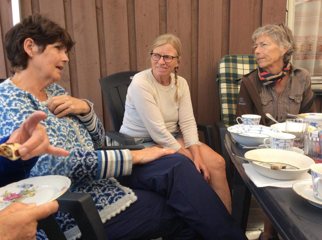 Her tok Aud i mot oss. Det var dekka opp i stover og på altanen til eit nydeleg måltid.