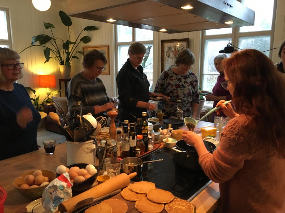 Åtte forventningsfulle kursdeltakere var samlet en lørdag for å lære å lage skikkelige julekranser. Tove Austad som eier og driver Åkerblomsten var kursholder. Det var den beste aktiviteten vi kunne hatt på en regntung novemberlørdag! Da vi kom hadde de fyrt i kakkelovnen i storstua, gløggen var varm og materialene lå klare. Tove viste og forklarte for oss, og vi boltret oss i massevis av materialer! Resultatet var 2 flotte dørkranser som alle var fornøyd med! Også så hyggelig vi hadde det! I pausen skulle vi nyte medbrakt mat, men vertskapet vartet opp med både nystekte sveler og gløgg i det koselige kjøkkenet. Tusen takk til Tove for et vellykket kurs!
