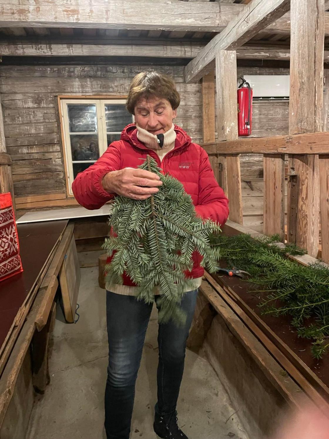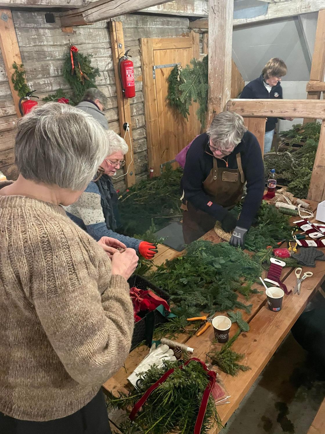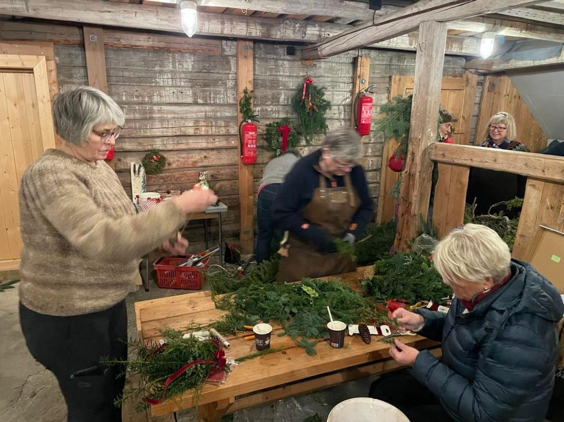Vi var samlet i det gamle fjøset på Vestre Bråte Bygdetun da temaet var å lage dørkranser og dørpynt til eget bruk og til å selge sammen med juletrær på lørdagen etter. I fjøset kunne vi rote og boltre oss mellom forbrett og gamle kubåser. Det ble laget massevis av flotte dekorasjoner!