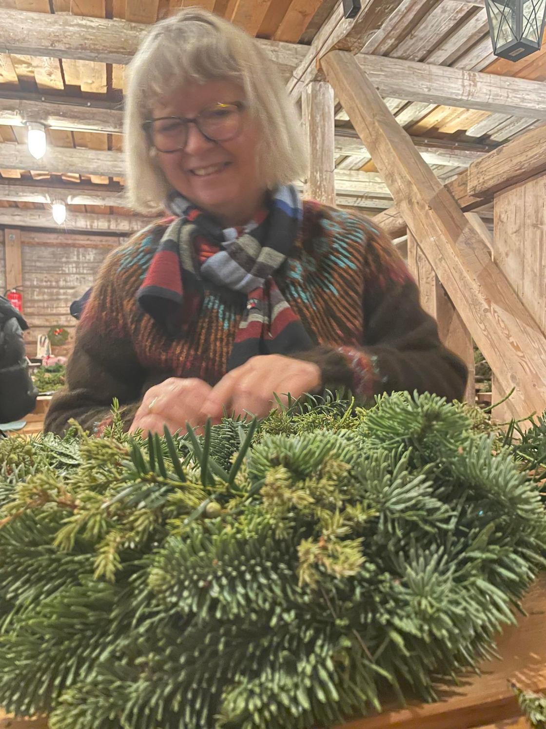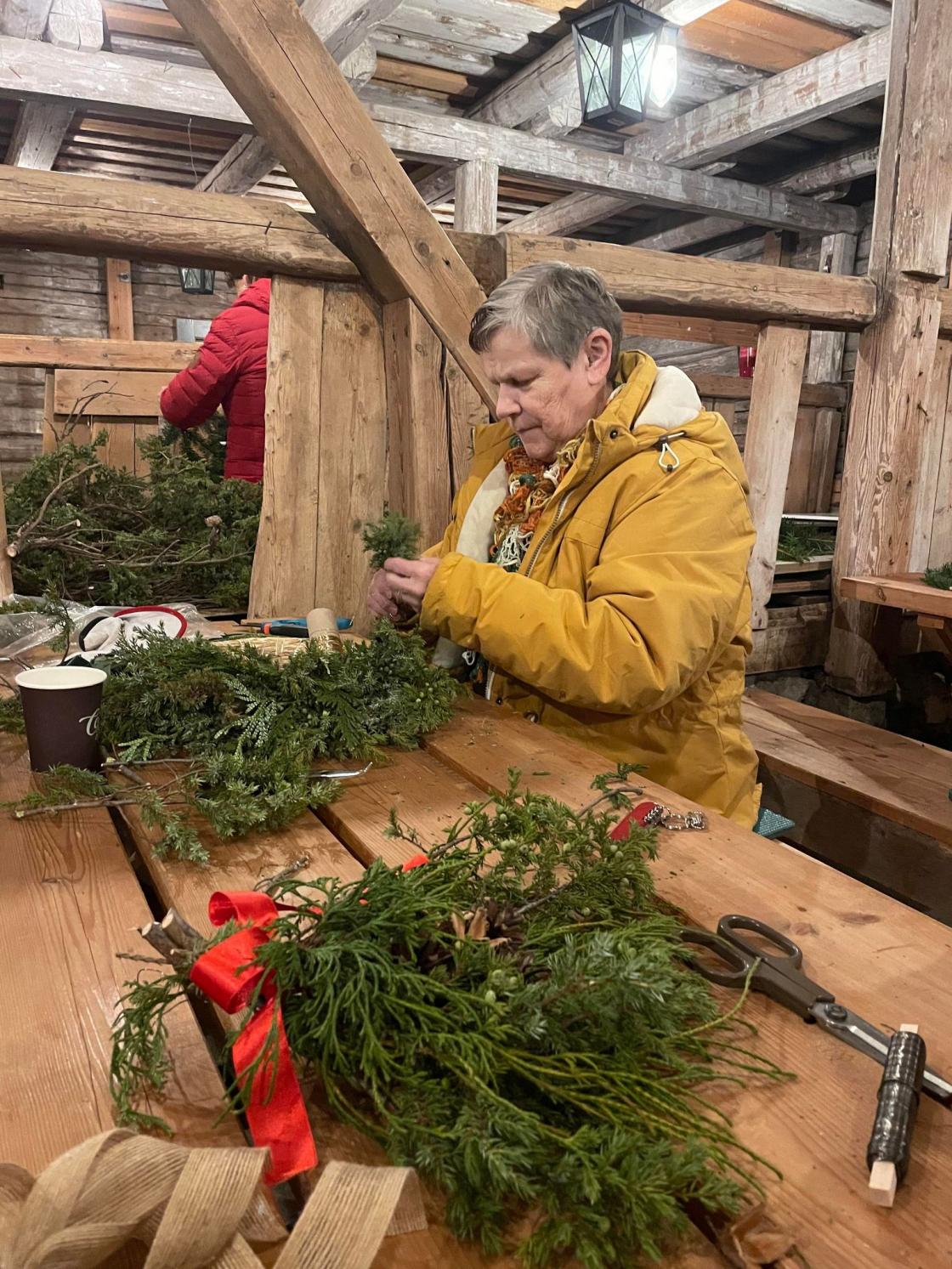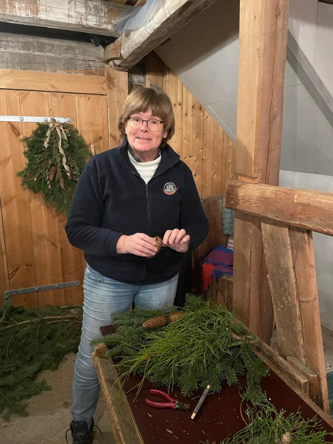 Vi var samlet i det gamle fjøset på Vestre Bråte Bygdetun da temaet var å lage dørkranser og dørpynt til eget bruk og til å selge sammen med juletrær på lørdagen etter. I fjøset kunne vi rote og boltre oss mellom forbrett og gamle kubåser. Det ble laget massevis av flotte dekorasjoner!