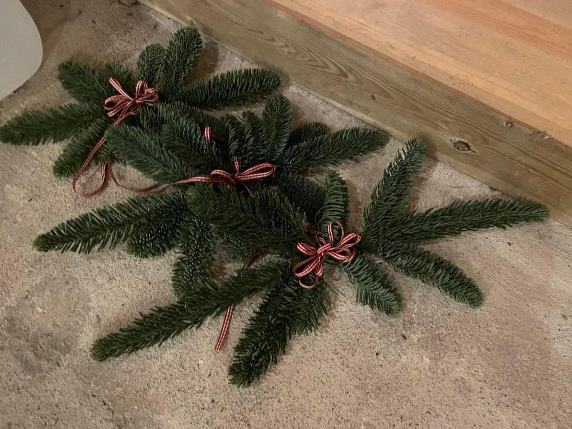 Det var skaffet til veier greiner av edelgran, einer, barlind og lerk. Og kongler av forskjellig slag. Og selvfølgelig flotte sløyfebånd.