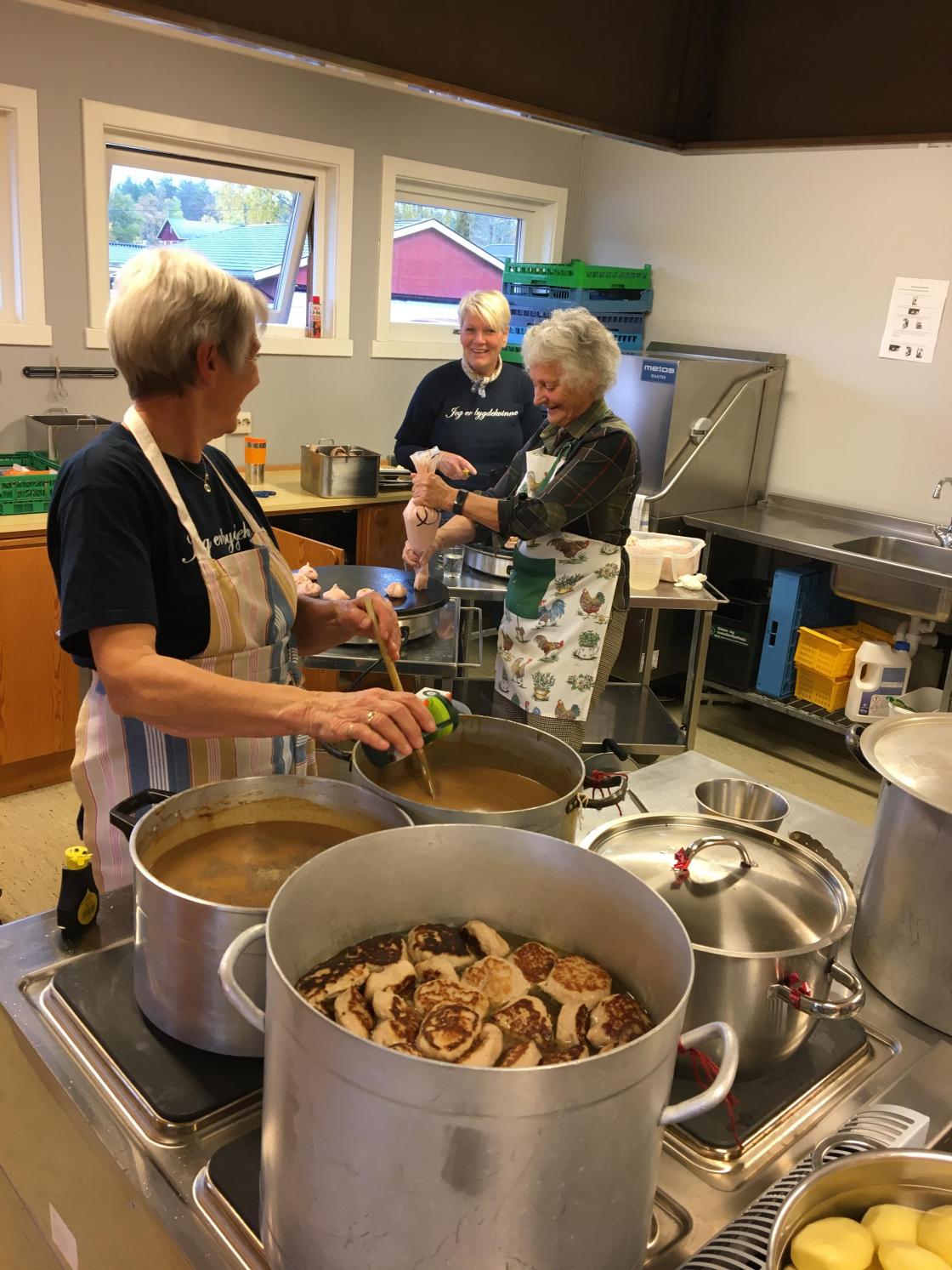 Hovedretten ble også laget på formiddagen, vi var til sammen 16 medlemmer involvert i jobben med alt fra å skrelle poteter, steke medisterkaker, lage saus, kålstuing og rørte tyttebær, til rigging og borddekking. Og ikke minst rydding og oppvask hele dagen!