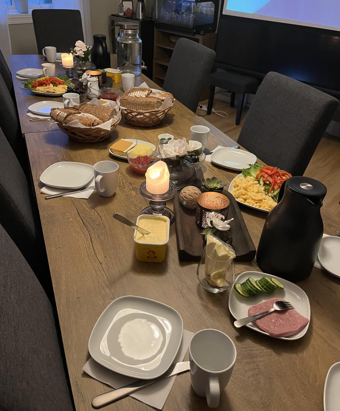 Marsmøtet vårt valgte vi å legge til Øyestad Østre Gård i Trøgstad. Der ble vi tatt imot av en smilende Eirin Fagerås, som først viste oss gårdsbutikken. Så ble vi geleidet inn i kafeen hvor det var dekket et nydelig bord til kveldsmat. Nybakt brød med pålegg og solskinnsboller.