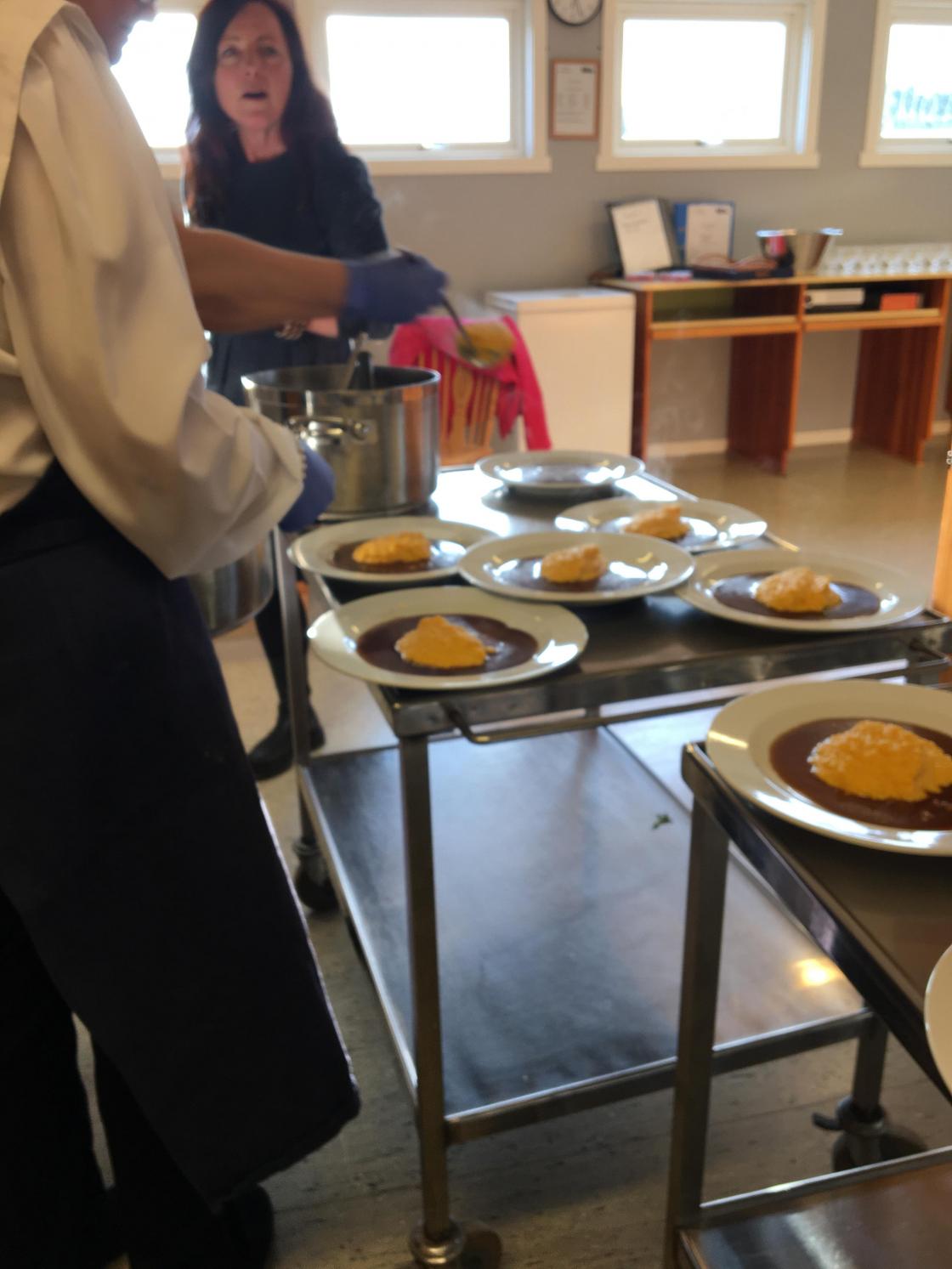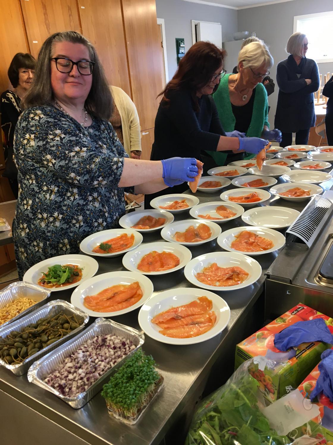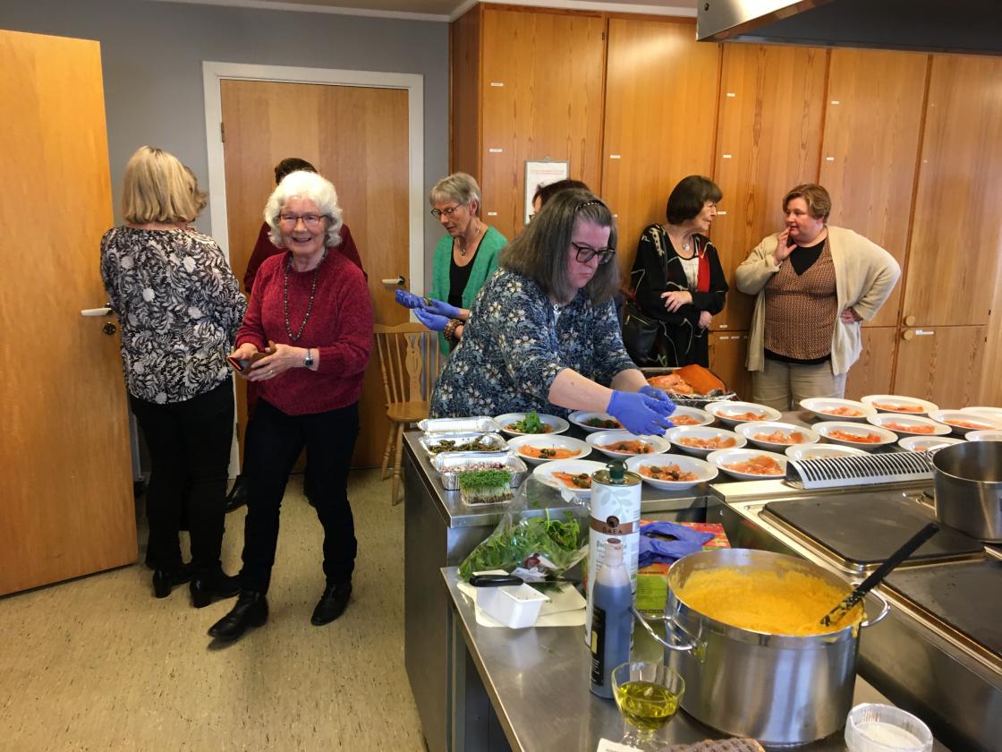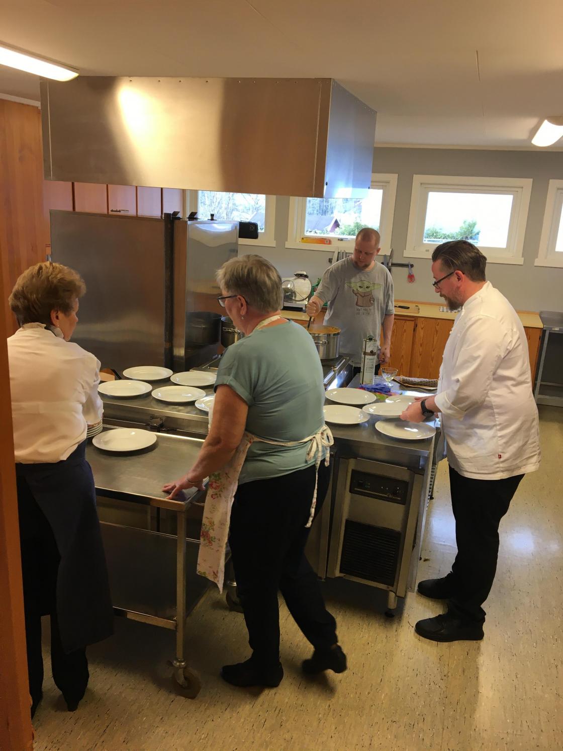 Vi har et godt samarbeid med ”Kafe Glede”, så vi hadde leid inn kokken Lars-Erik Gullaug. Han sammen med sine hjelpere, hadde gjort en del med maten på forhånd. Lars-Erik fortalte hva som var gjort på forhånd og røpet forskjellige kokkeknep. Vi stilte oss opp inne på det store kjøkkenet og iakttok hva som ble gjort. Det kom mange spørsmål, og vi fikk gode tips. Noen frivillige av våre egne var med på å anrette maten.