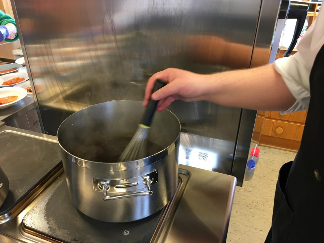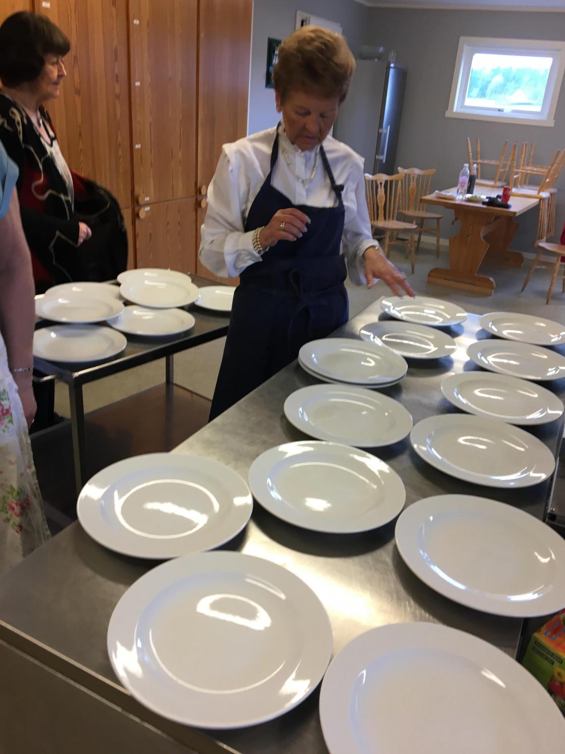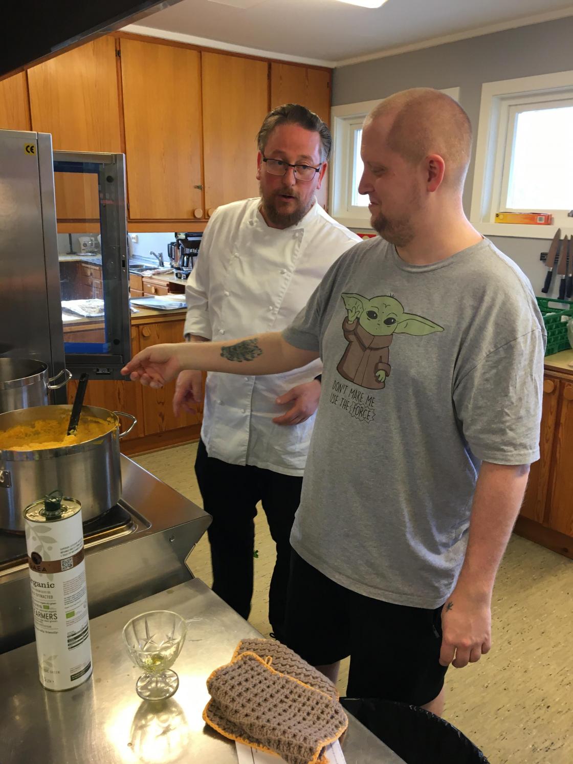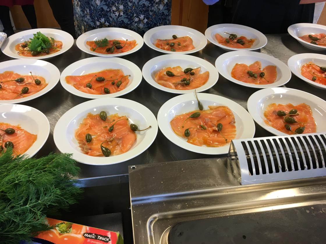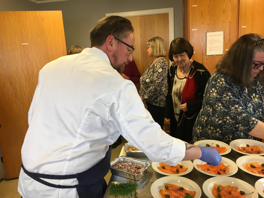 Vi har et godt samarbeid med ”Kafe Glede”, så vi hadde leid inn kokken Lars-Erik Gullaug. Han sammen med sine hjelpere, hadde gjort en del med maten på forhånd. Lars-Erik fortalte hva som var gjort på forhånd og røpet forskjellige kokkeknep. Vi stilte oss opp inne på det store kjøkkenet og iakttok hva som ble gjort. Det kom mange spørsmål, og vi fikk gode tips. Noen frivillige av våre egne var med på å anrette maten.