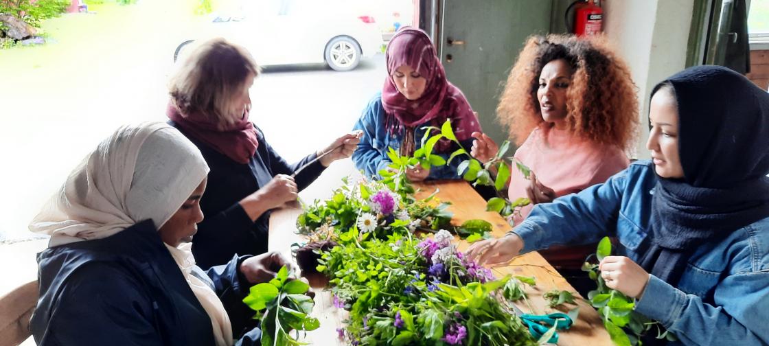 Binding av blomsterkranser - sommeravslutning med introduksjonsklassen ved Folkeuniversitetet