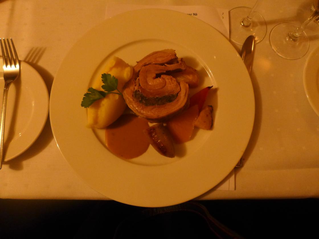 Festmiddag om kvelden. Her var det to-rettars, nydeleg middag. På menyen stod det: "Forrett: Husets gravede sik fra Norefjord og raket fjellørret-rogn fra Hardangervidda. Servert med rødbetesalsa, dampet Folva poteter fra Vestfold, rømme med lime og flatbrød fra Uvdal. Hovedrett: Langtidsbresert rulade av lammesider fra spælsaulam fra Vegglifjell og med husets hjemmelagede lammepølser, servert med ovnsbakte grønnsaker, kremet lammeskysaus med urter og kokkens potetmos/ puré." Eit herleg måltid!