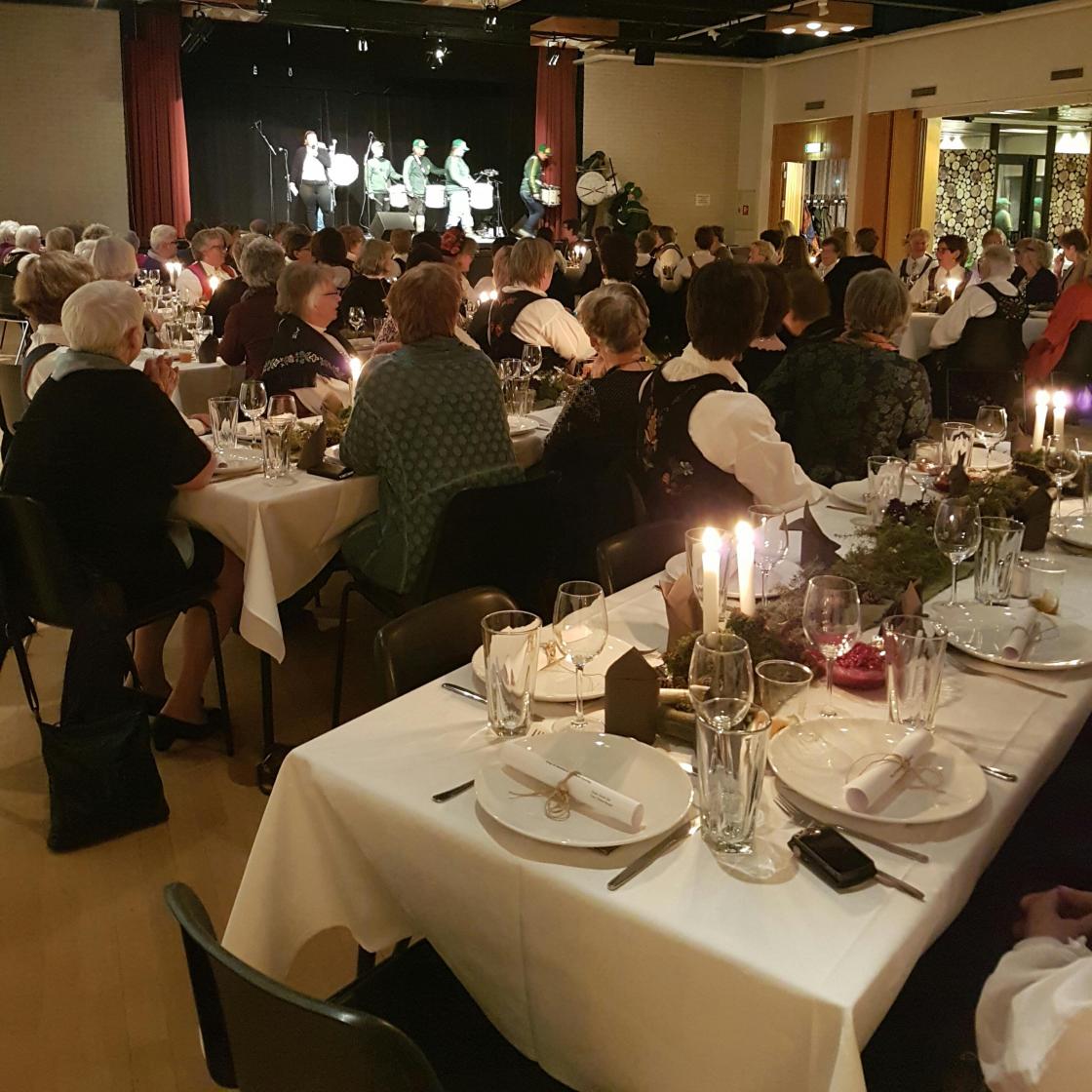 Videre bar veien oss til Bøndernes Hus på Skotterud, hvor årsmøte skulle holdes. Der ble vi møtt av barnehagebarn som hadde stilt seg opp foran inngangen, de ønsket oss velkommen med kjente og kjære sanger. Og bare over terskelen så var det 1. klassingene sin tur til å synge Eidskog sangen for oss. Forøvrig, den også skrevet av hans Børli. Det var pyntet overalt hvor vi gikk, og «skogsdronninga» stod nederst i trappa og hilste oss velkommen. Mange utstillere hadde fått sine utstillinger på plass i salen, og det var en flott måte å vise oss hva bygda har å by på. Solvår Sundkøien ønsket oss velkommen til Eidskog på vegne av Eidskog Bygdekvinnelag, og Sigrid Holmen fra fylkesstyret ønsket velkommen til årsmøte. Vi kom godt i gang med årsmøte-sakene våre på fredag, og kunne si oss fornøyde da vi avsluttet dagen. Om kvelden skulle det være festmiddag i Rådhusets festsal. Der ble vi møtt av «Takt skar du ha», et trommekorps i Eidskog for voksne damer. En opplevelse å bli møtt av dem. Festsalen var pyntet til fest ja. Nydelige bord-dekorasjoner hentet fra naturen selv. God plass rundt matbordet, det er heller ikke alle forunt. Vi ble servert skinkesteik, poteter og grønnsaker (kortreiste råvarer må dere vite) og surkål, og itte å forglemme rørt tipper. Nydelig mat, så all ære til matgruppa. Det ble nok skrelt noen kilo av både poteter og gulrøtter. Som dessert var det tilslørte bondepiker, bedre har ikke undertegnede smakt siden barndommen. Konferansier denne kvelden var Vibeke Børresen, som ledet oss gjennom kvelden på en lekende lett måte. Kamilla Thue ønsket oss velkommen til Eidskog, og fortalte oss litt både i forhold til historie, og hva plasseringen av Eidskog har betydd opp gjennom årene. Eidskog Bondelag var hyret som servitører denne kvelden, en jobb de fullførte med glans. Det ble underholdning av det lette, glade slaget av Bjørg Ruud og Anne Marit Ånerud. Latteren satt løst i lokalet. Sandra Gaustad sang flere sanger for oss med sin nydelige stemme, først som solo. Senere sammen med koret «Korsettene». Kvelden var særdeles vellykket, men hvis dere lurer, så ja, selvsagt ble det kaker. Det var et bugnende kakebord. Og kaffe, noen edle dråper kunne også nytes for de som ville det. En innholdsrik dag var over, og vi i styret trakk oss tilbake til Søstun Gård (som trenger et helt kapittel for seg selv, så det får bli en annen gang). Men det må nevnes at det var en fantastisk plass, med hyggelig vertskap.