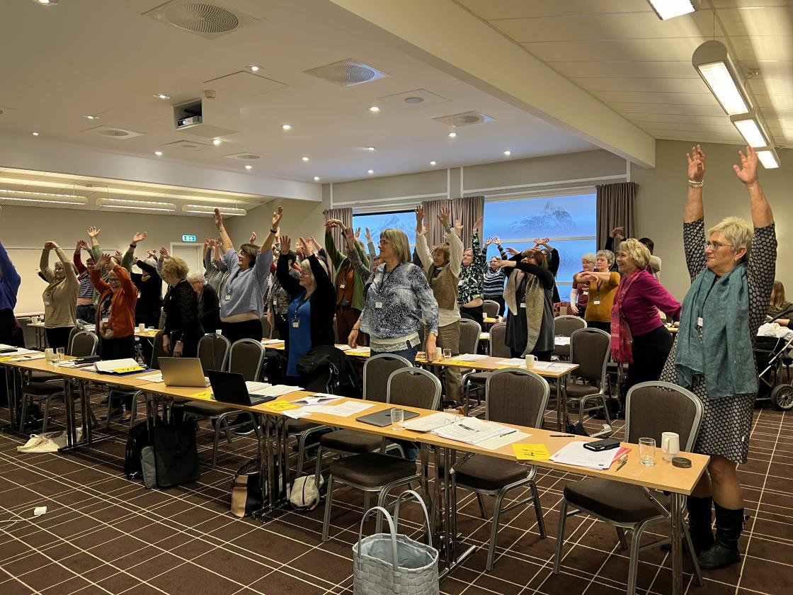 Så ble det Lunsj på hotellet, før videre program. Monika Frisvold Vågan fortalte nytt fra Norges Bygdekvinnelag og svarte på spørsmål fra salen. Så fikk vi en innføring i førstehjelp av Bård Tokle, som jobber i ambulansen på Åndalsnes og er med i Røde Kors.