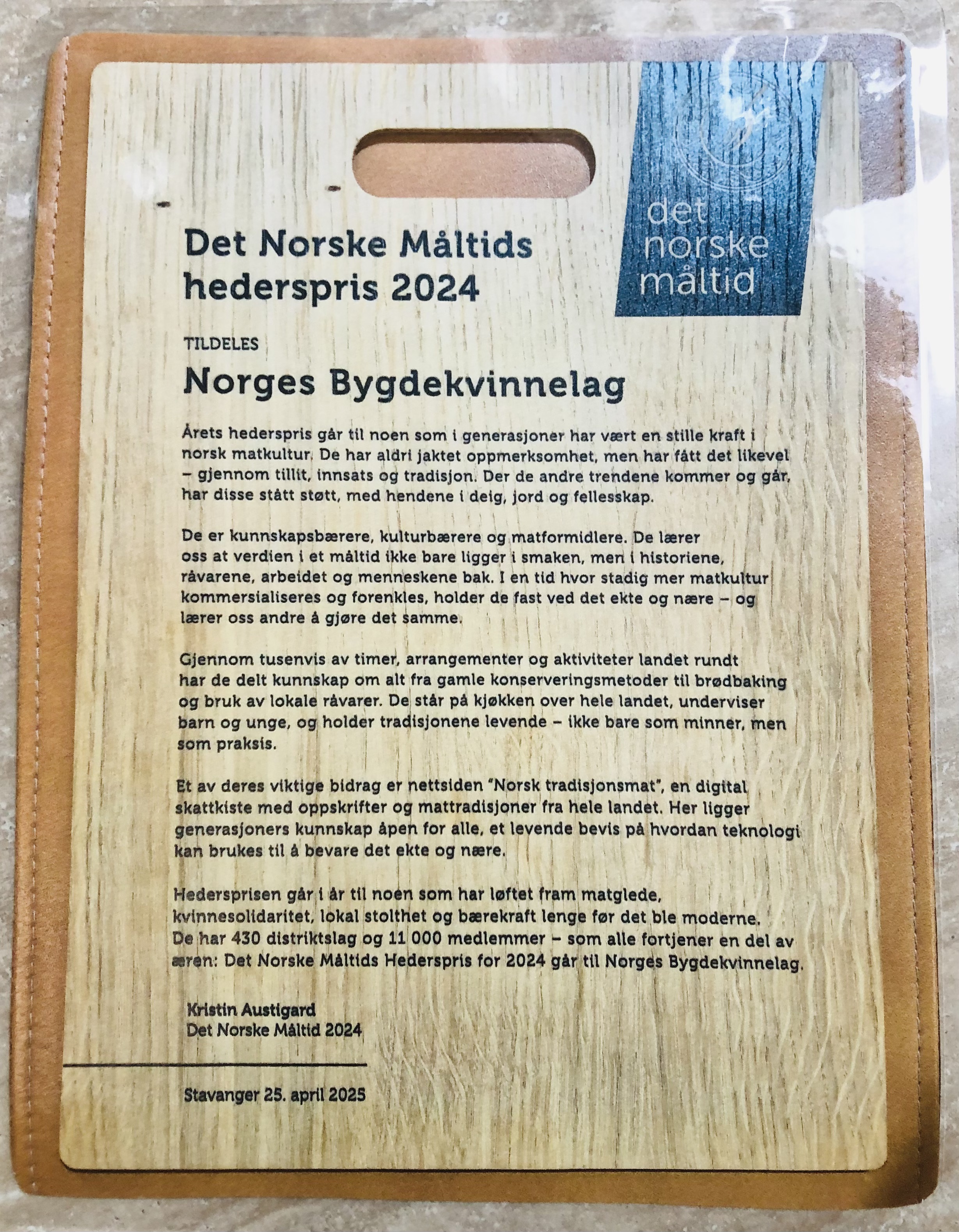 På styremøtet 14. oktober hadde me besøk av hedersprisen "Det norske måltid"!