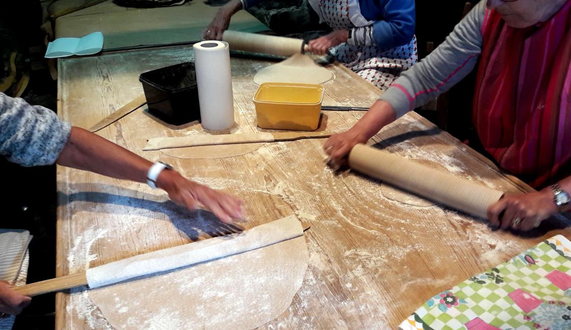 To laurdagar no i mai har medlemmer i Kinsarvik bygdekvinnelag samlast til flatbrødbaking i eldhuset på Bråvoll.