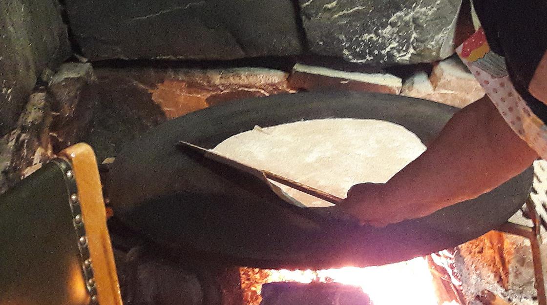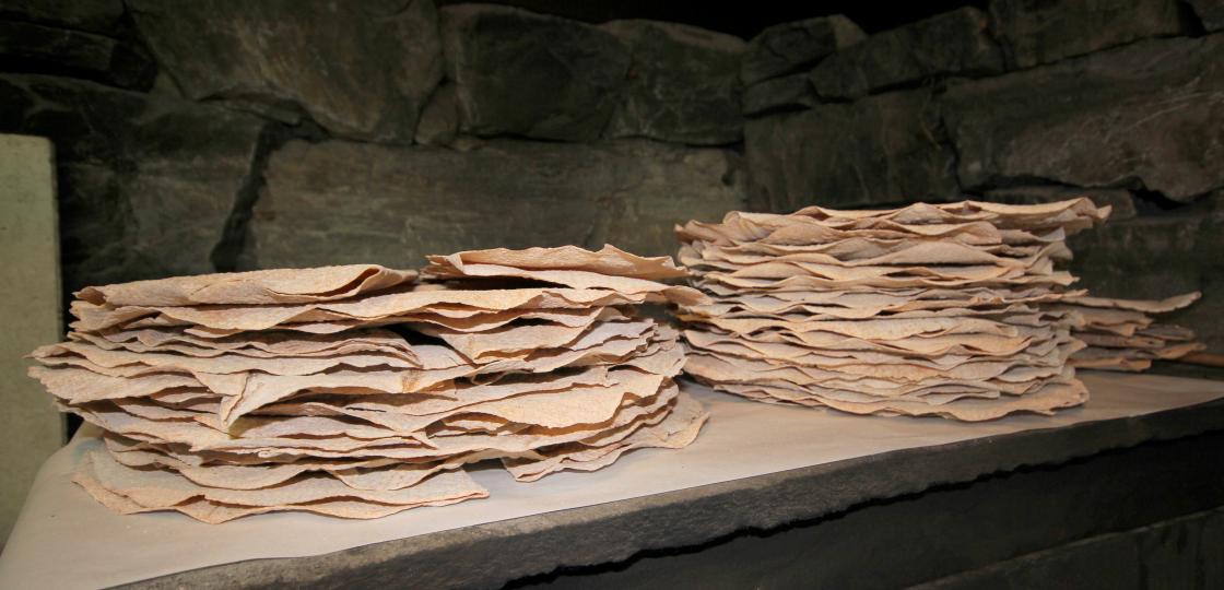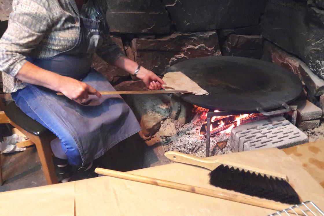 Tynt, sprøtt og godt kan stå som konklusjon etter flatbrødbakinga i eldhuset på Bråvoll.