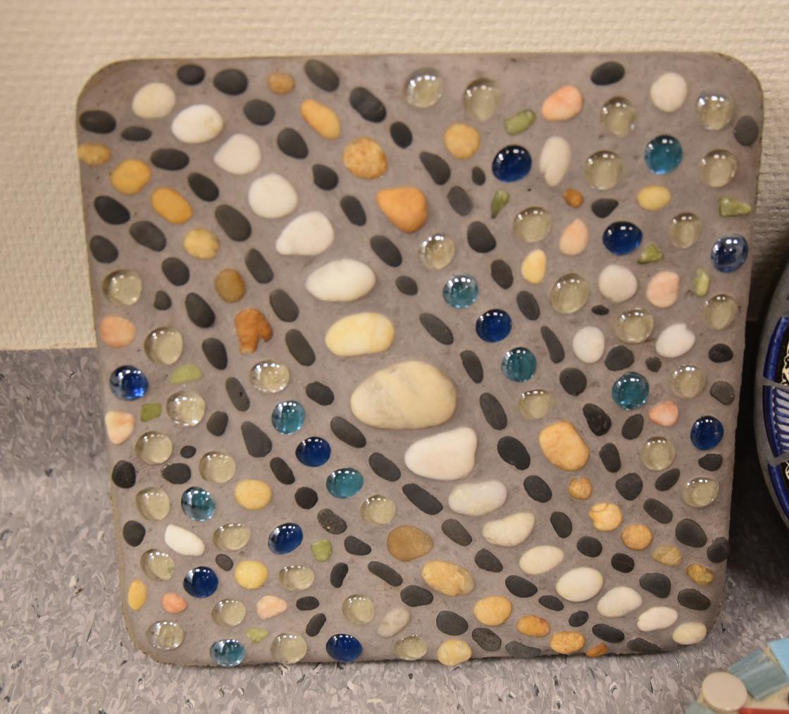 Torhild Solberg fra Kråkstad Bygdekvinnelag lager mosaikk av dem på tråkkeheller.