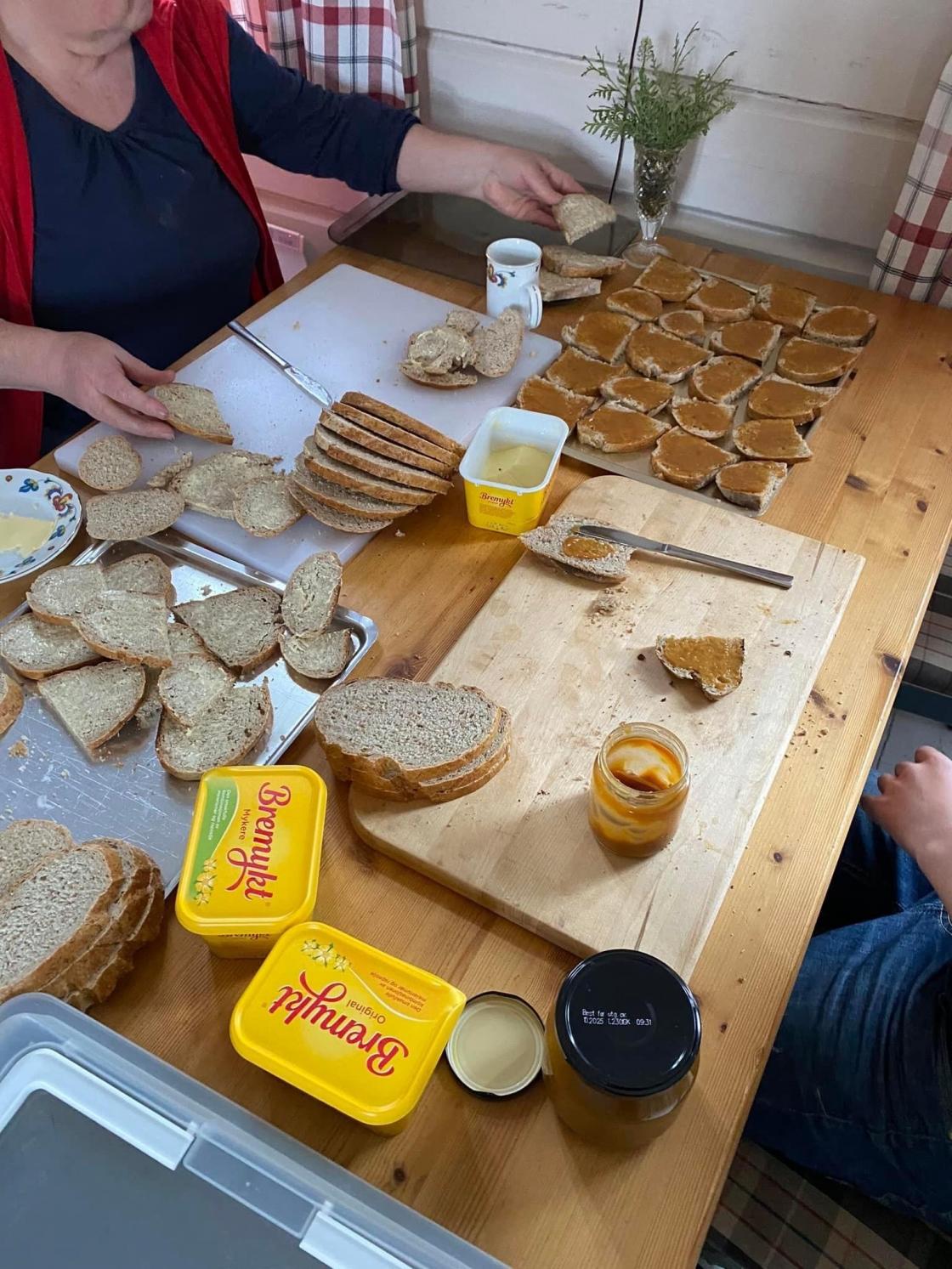 De spiste seg mette på bakerovnbrød med ost, sukker, syltetøy og ikke minst hjemmelaga prim. over ti brød gikk med til den matpausen.