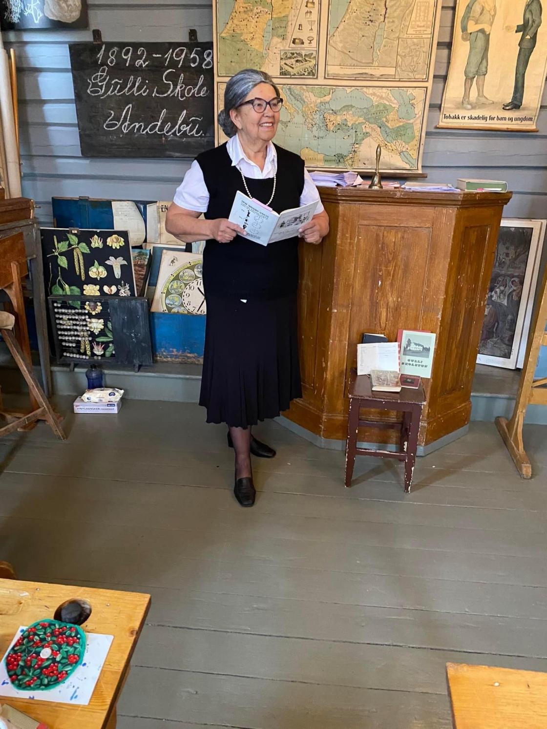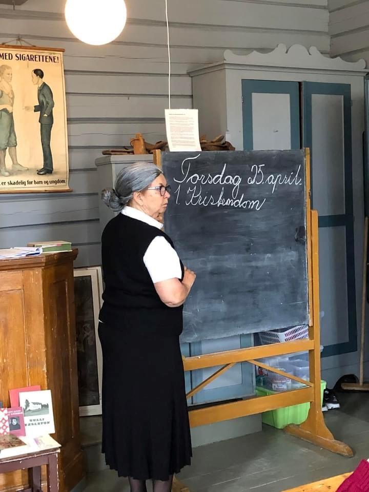 Rundt 45 elever pluss lærere fikk oppleve Fru Berg gjennom en skoletime med innslag av det meste av læreteknikker en brukte på skolen før i tida.
