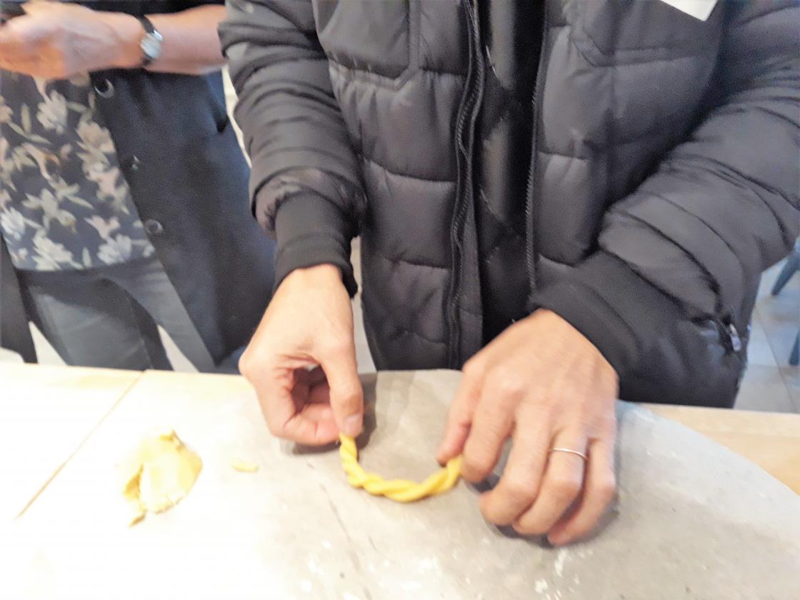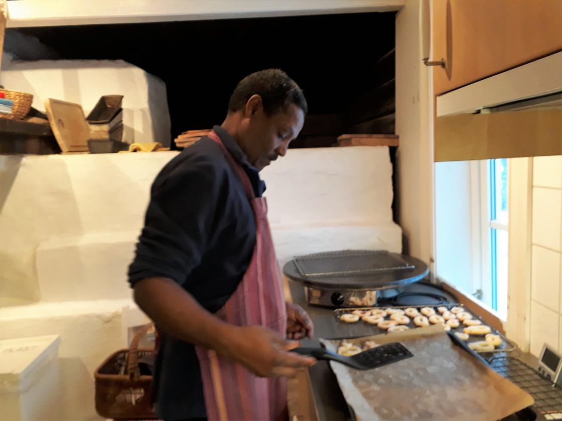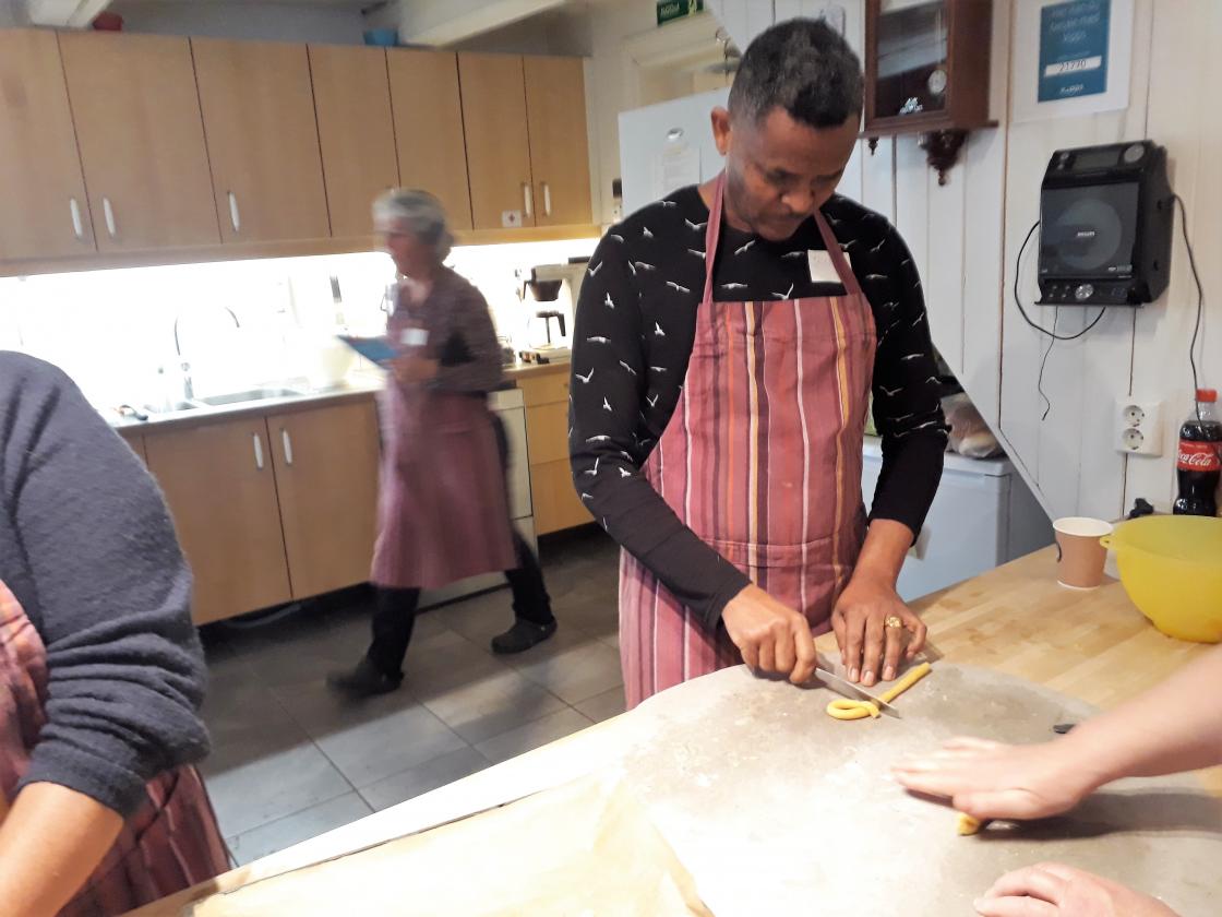 Deigen til Berlinerkransene var laget på forhånd, og utbakingen gikk som en lek. Ekstra kreativitet sto en av de mannlige deltakerne for, han introduserte en flettet utgave av kransene, som ble riktig fin når den ble stekt. Flere deltakere er fra Syria. Der er det ikke vanlig at menn baker, det er det kvinnene som gjør. En fortalte at dette var hans debut som baker. I tillegg til Berlinerkranser ble det også laget deig, og stekt kokosmakroner. Resultatet ble aldeles utmerket, og alle fikk med seg en en smak hjem.