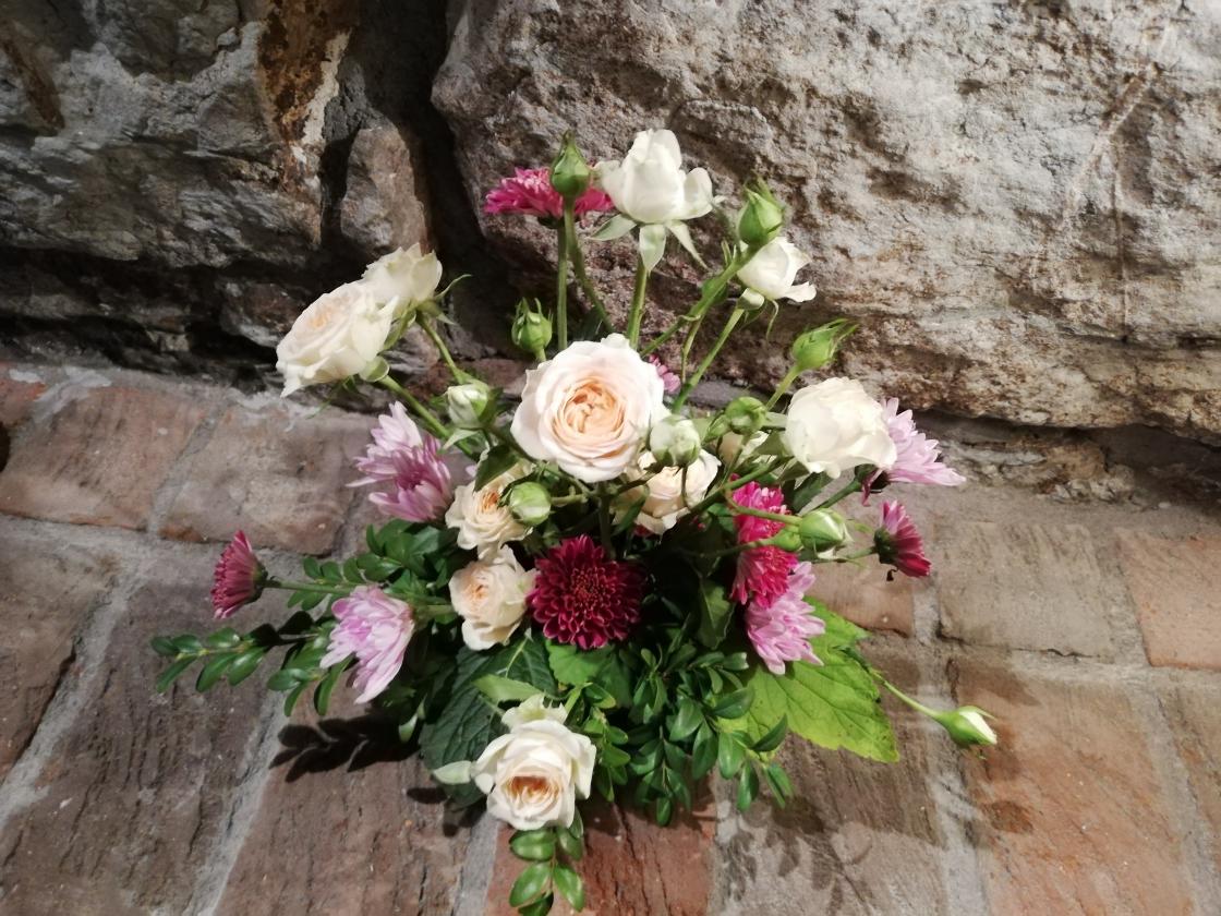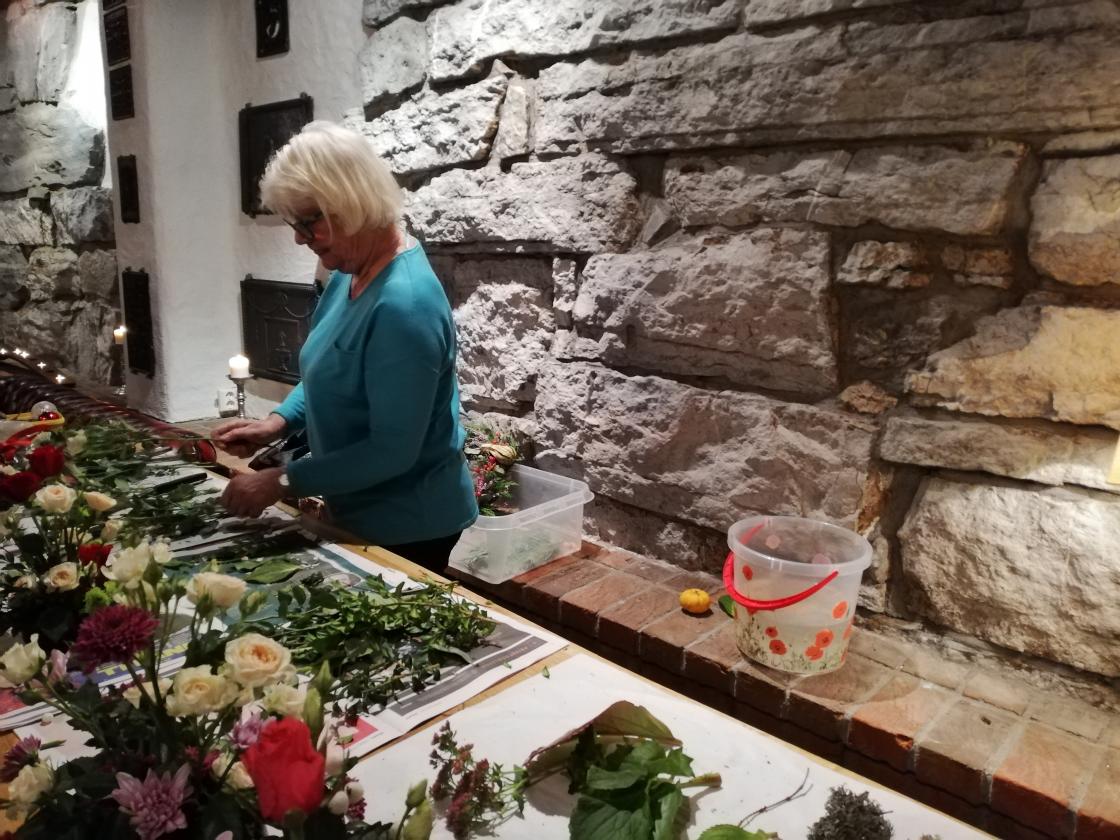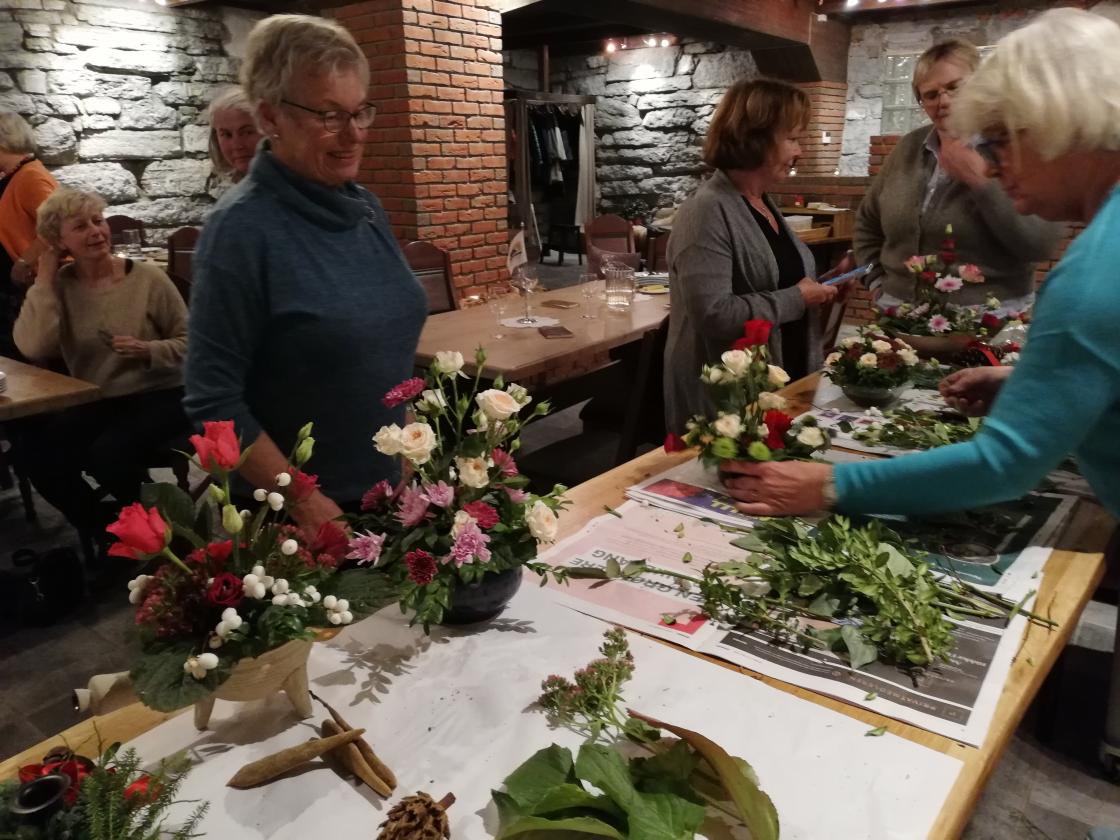 Kveldens underholdning sto Rose Gran for. Hun er utdannet blomsterdekoratør, og selv om det er mange år siden hun praktiserte i faget hadde hun ikke glemt gamle kunster! Vi lærte hvordan vi kan "trylle" frem fine dørkranser og skåler med friske blomster og annen pynt til jul! Det hun laget ble loddet ut og overskuddet gikk tit vårt nye prosjekland, Guatemala. Yvonne orienterte oss om prosjektet som nå er i gang.
