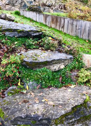 Vi vandret videre på stien nedover i hagen. En gravemaskin hadde sørget for at en opprinnelig bratt skråning ble lagt i terrasser – selv hadde de og fylt på med massevis av jord. I den bratte skråningen er det plantet bunddekkende planter. Spirea/Tor og Kranstopp/Stephanandra incisia Crispa, Magnoliatræ, Japansk lønn ,Hengeblodbøk, Hengehjertetre og pagodetre er plantet i bunndekket
