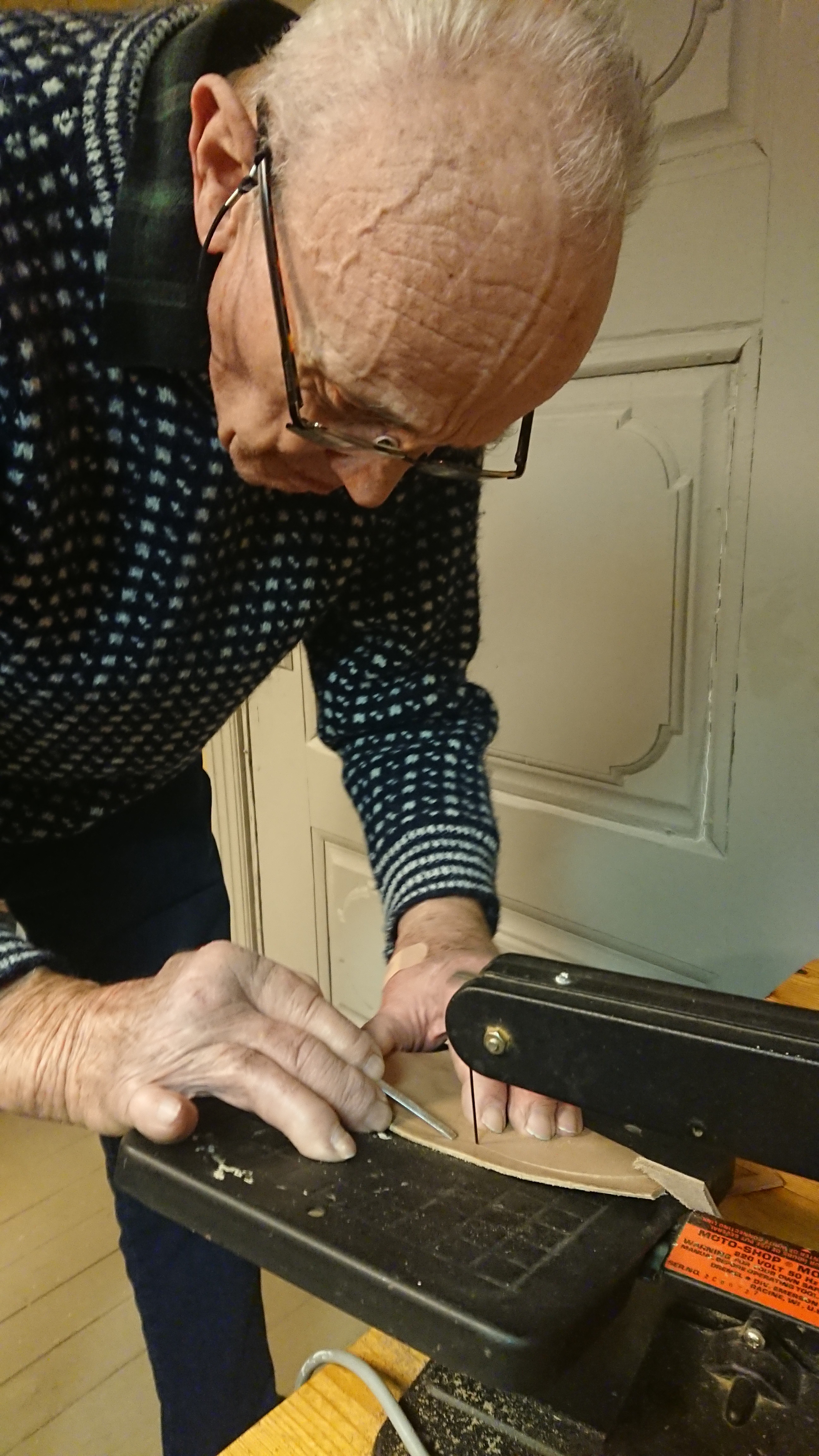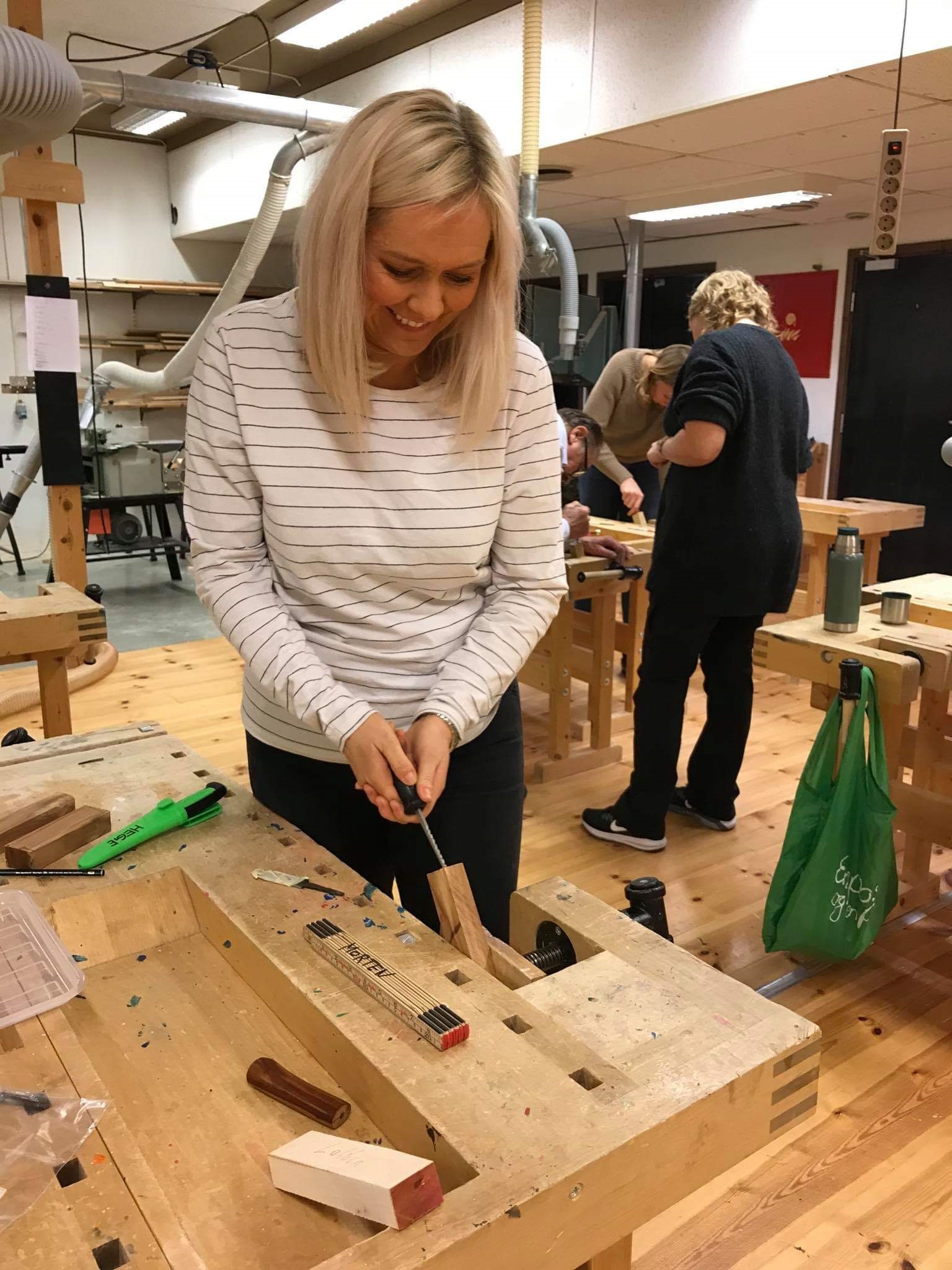 Kurset gikk over 4 kvelder, - 2 kvelder i sløydsalen på skolen der vi laget knivskaft og 2 kvelder på Düvelgården der vi laget slire. Karene sørget for at vi fikk emne til knivskaft, ordnet knivblad, kjøpte inn skinn til slire og lånte bort verktøy. Vi var lærevillige og karene stod på for å hjelpe oss. De tre kveldstimene med innlagt kaffepause gikk så fort. Da kniv og slire var ferdig, var både knivkarene og vi stolte over at resultatet blei så bra.