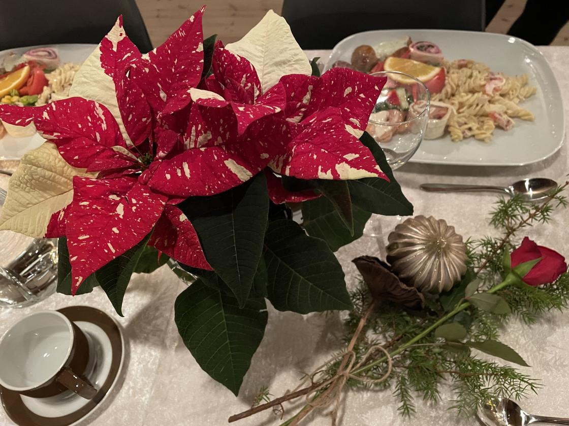 Langborda var vakkert pynta og dekka på til fest, og velsmakande joletallerken frå Lene's kjøken vart servert. Til dessert fekk me fruktsalat og riskrem.