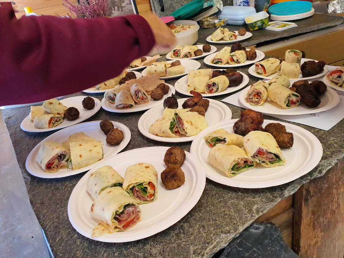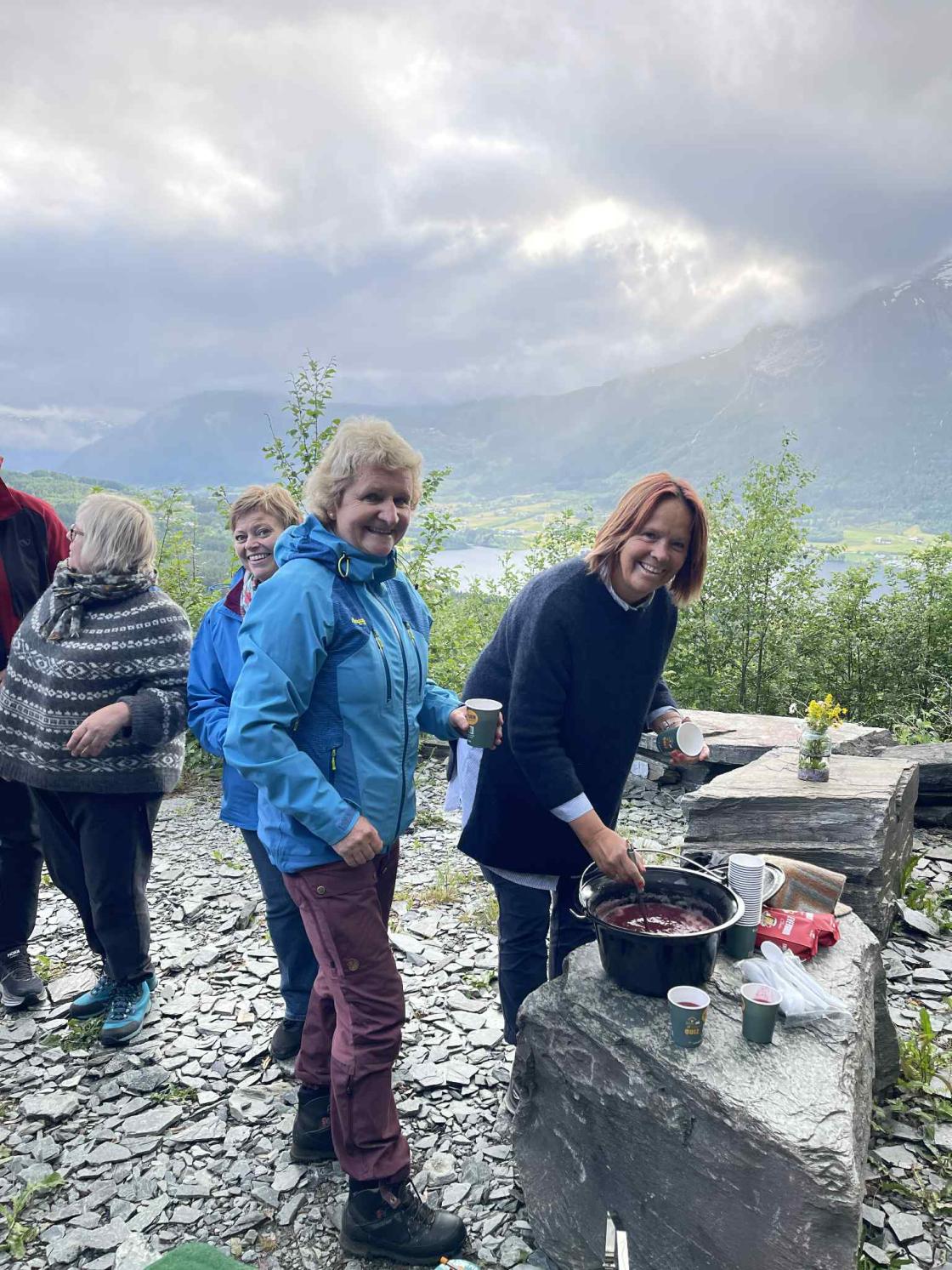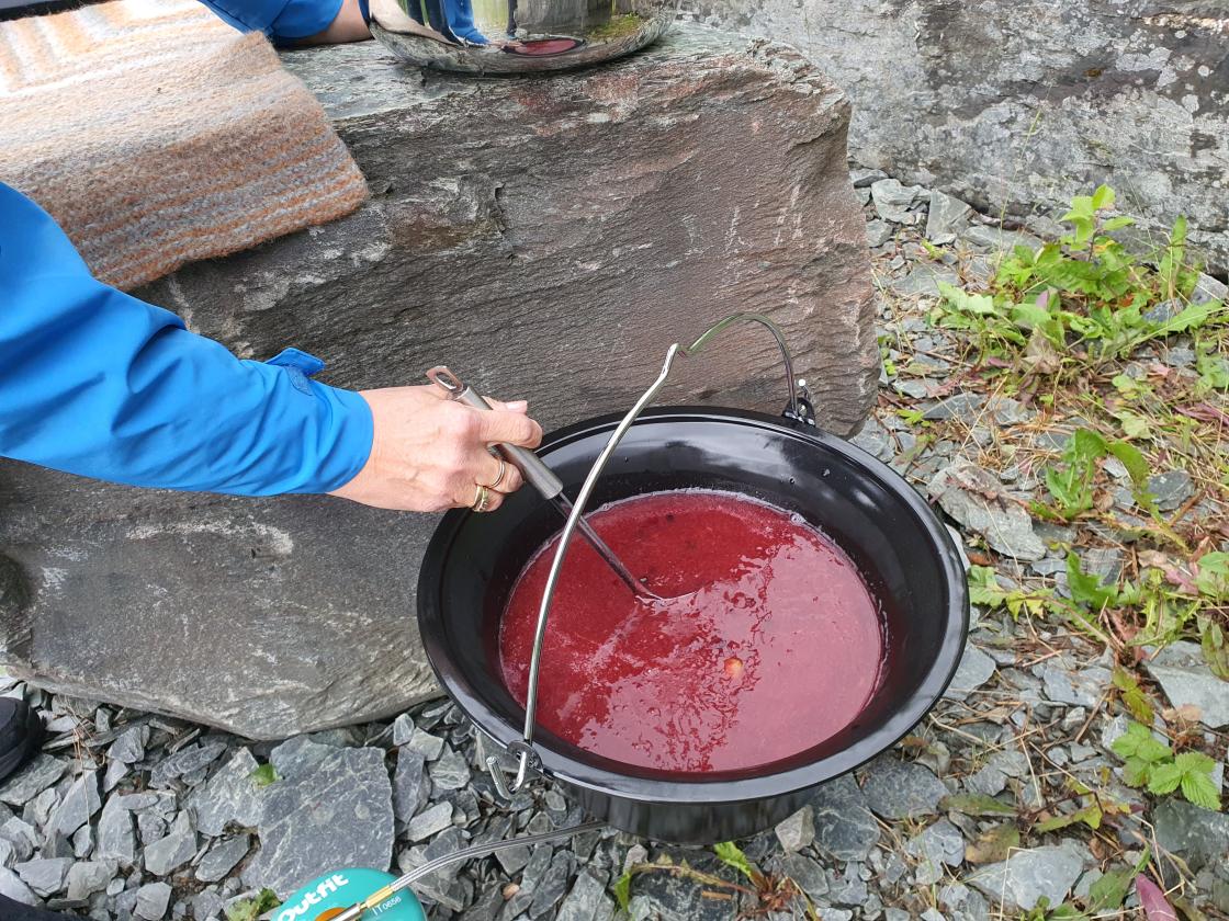 Bjørgum Bygdekvinnelag søkte og fekk prosjektmidler til markering av Friluftslivets år. Me har innvistert i kokeutstyr til utebruk. Denne kvelden diska bakegruppa opp med rabarbrasuppe til turgjengen, tapastallerken med lefseruller laga av potekake frå Mosstova, kjøttboller, dadler surra med bacon og urteflatbrød frå Mosstova i Folkedal. I tillegg hadde bakegruppa laga rabarbra-kake og muffins, som smaka ekstra godt saman med nylaga "skogskaffi".