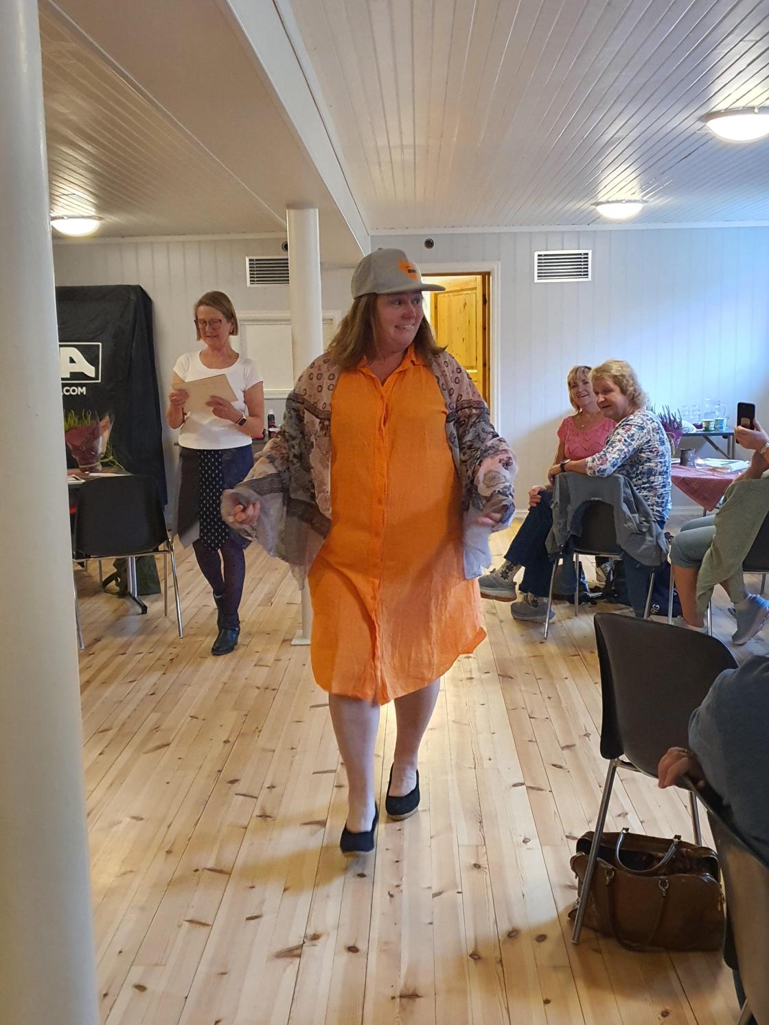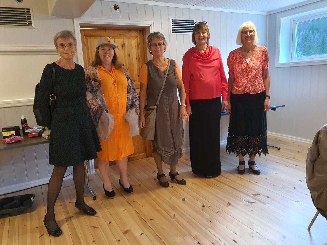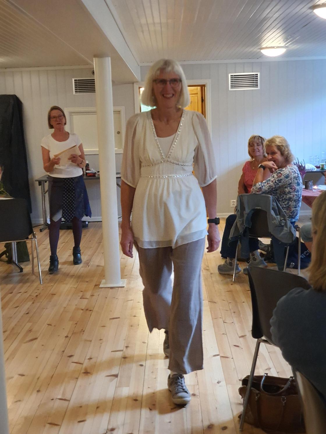 Kveldens høgdepunkt var mannekengoppvisning av fem bygdekvinner frå styret. Dei hadde tidlegare vore i Bytebua og funne seg to antrekk kvar, som dei viste fram til stor entusiasme for oss andre. Torunn Eimstad fortalte om dei ulike antrekka og totalsummen for dei ti antrekka, som vart vel 1500 kroner. Det er mykje å spara på å kjøpa brukt, båe for lommeboka og for miljøet.
