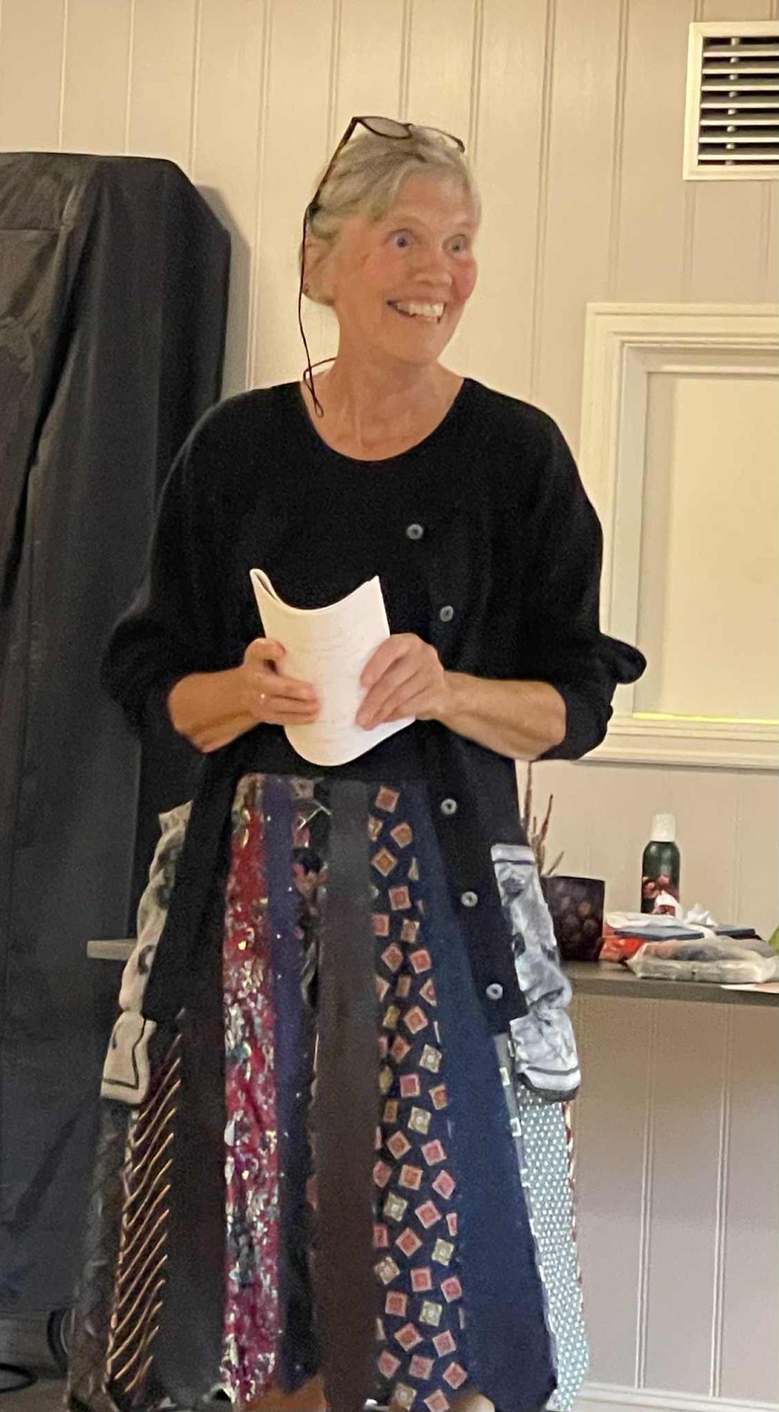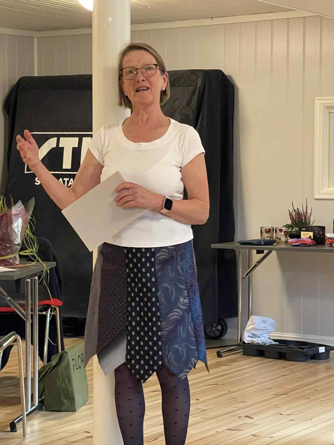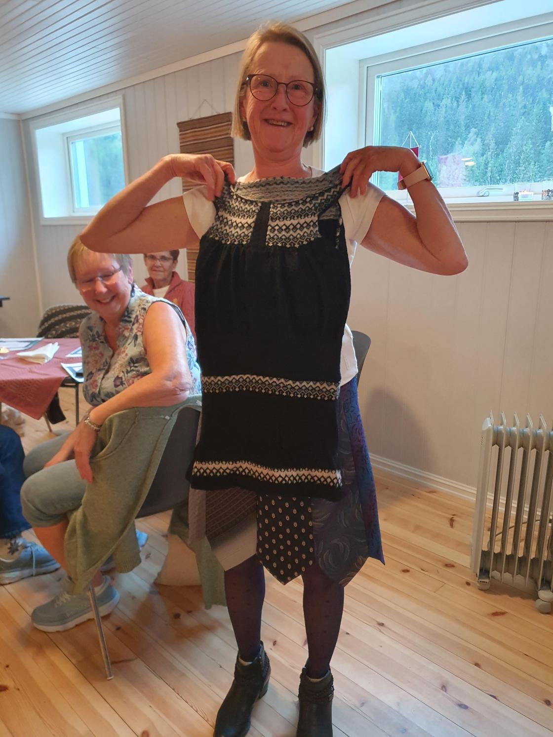Kveldens høgdepunkt var mannekengoppvisning av fem bygdekvinner frå styret. Dei hadde tidlegare vore i Bytebua og funne seg to antrekk kvar, som dei viste fram til stor entusiasme for oss andre. Torunn Eimstad fortalte om dei ulike antrekka og totalsummen for dei ti antrekka, som vart vel 1500 kroner. Det er mykje å spara på å kjøpa brukt, båe for lommeboka og for miljøet.