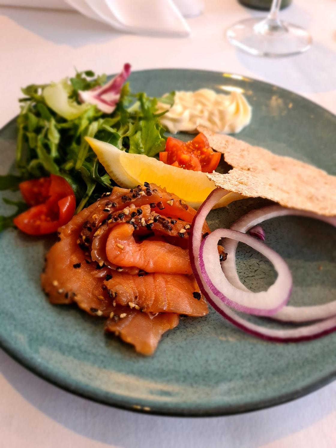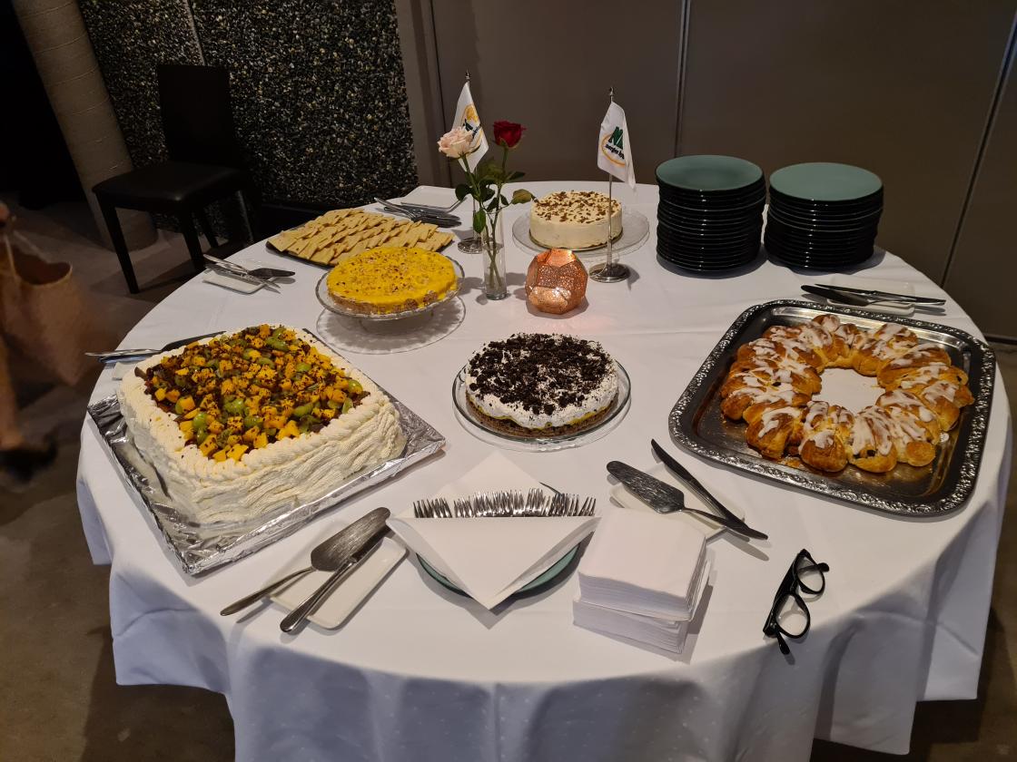 Til foret fikk vi røkt gravet Trønderlaks med salat og flatbrød og til hovudrett fik vi stekte oksefilet med grønnsaker. Maten var bare nydelig og vi blei gode og mette. Så kakene måtte vi vente litt med, for det var jo seks forskjellege kaker. Og en ville jo smake på de alle.
