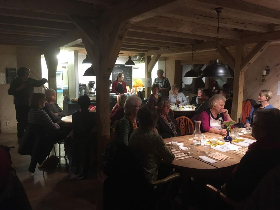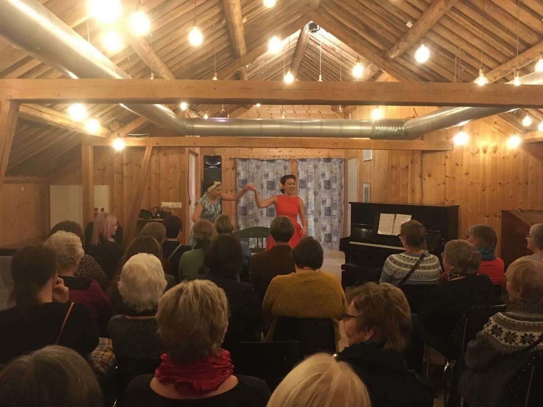 Det var en koselig kveld med besøk fra Teater Ibsen med en nydelig forestiling. Stykket heter " På en grønnmalt benk i haven". Det kom ca. 40 muntre og spente kvinner. Det blei god stemning og et veldig kjekt musikkteater. De brukte kjente sanger og fikk publikum med sangene!