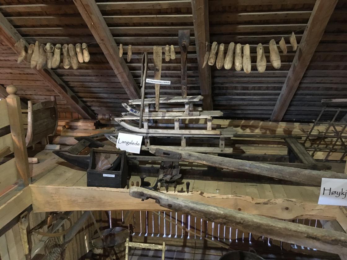 Så var det tid for omvisning. Jan fortalte litt om historien rundt dette gardsmuseet. Det startet med at et barnebarn ønsket å feire sin konfirmasjon oppe på låven. Det kunne ikke farfar si nei til, så da satte han i gang med å bære ut gammelt høy og gammel redskap m.m. før han tok fatt på støvsuging av gulv, vegger og tak. Gjenstandene ble vasket/spylt, og båret inn på låven igjen. Der ble de plassert i grupper ut fra hva de ble brukt til: jordbruksredskaper, skomakerverktøy og skogsarbeiderutstyr m.m.