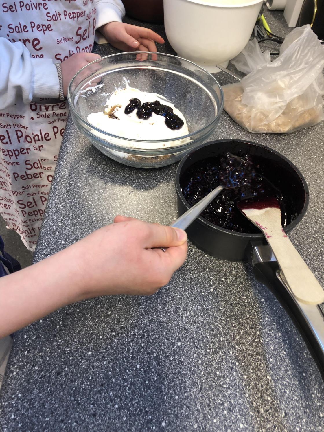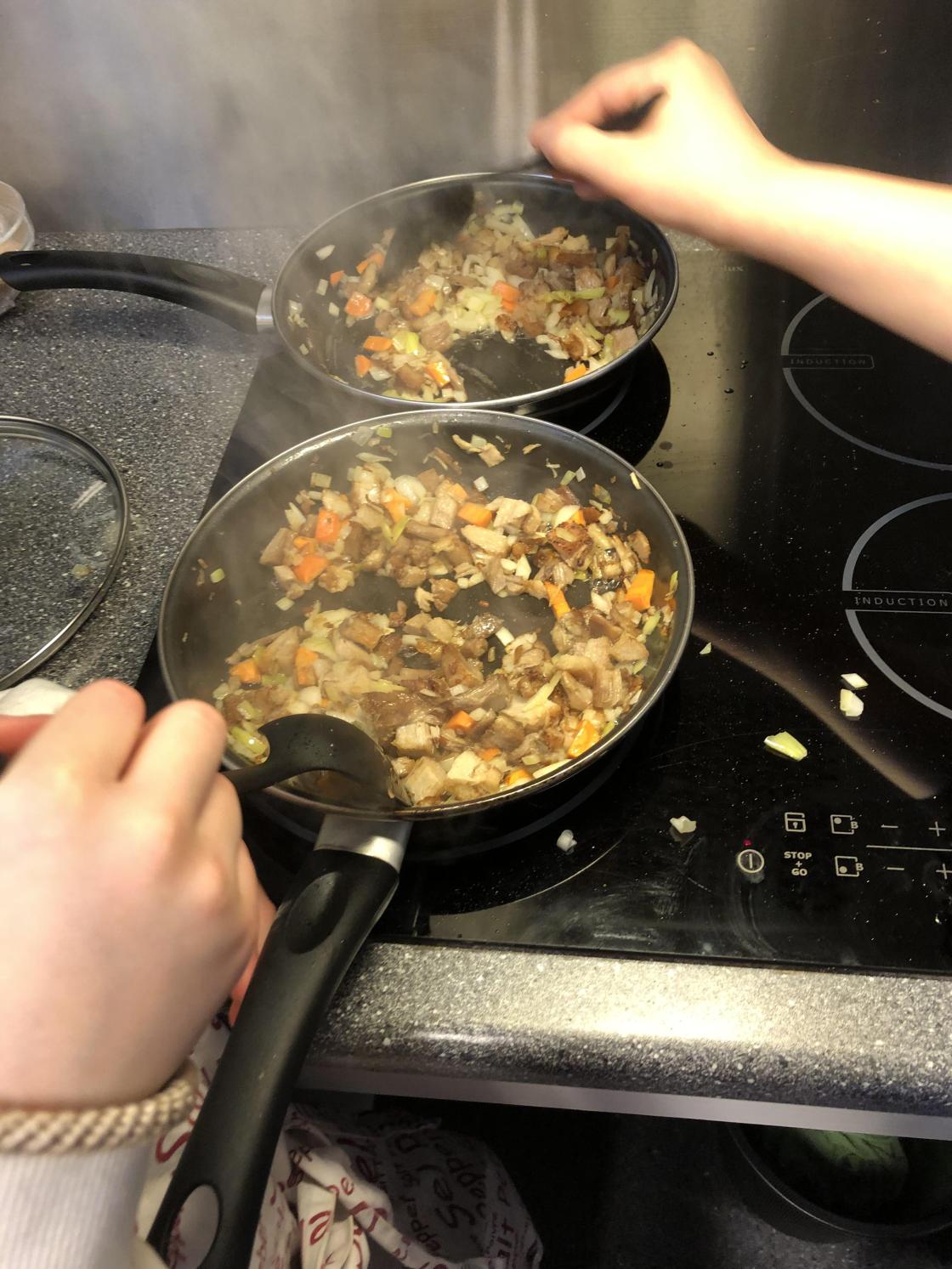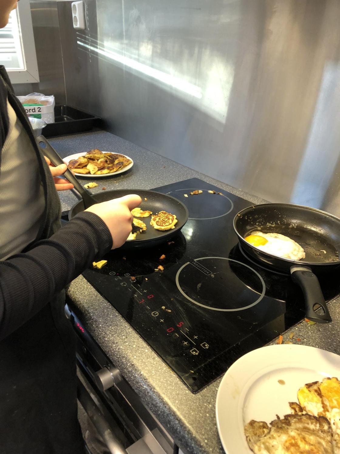 Så fikk elevene være med å lage pletter av poteter og pytt i panne av kokte poteter, ribberester, løk og paprika. I tillegg stekte de speilegg til å ha på toppen.