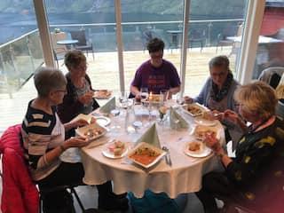 Torsdag 25/4 var vi 35 damer som reiste til Kleppenes Gard i Hyen. Her fekk vi servert kjempegod mexicansk tomatsuppe med tilbehør, og nydeleg kake til kaffien. Det var god stemning og Anne Karin Kleppenes fortalde om historia til Kleppeneset og livet der. Ein fantastisk plass med flott utsikt over Hyefjorden. Var bra heldige med vêret, sjøl om vi valde den eine dagen med litt regn i lufta, og fekk sjå oss litt om ute og på Stabburet der det heile starta. Her var det plass til 24 gjester, no er fjøsen ombygd til flott selskapslokale. Ein plass vi kan anbefale på det varmaste. Vi kjem gjerne att, her held dei og tapaskurs som vi kan og få til i regi av Bygdekvinnelaget om det er interesse for det. Takk for en kjekk kveld ilag, bygdekvinner.