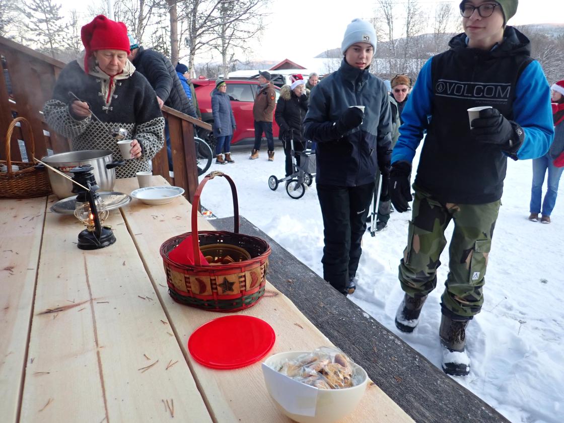 Servering av gløgg og pepperkaker, bålpanne, tenning av julegran, juleverksted, salg av gryterett med tilbehør , kaffe og kaker.