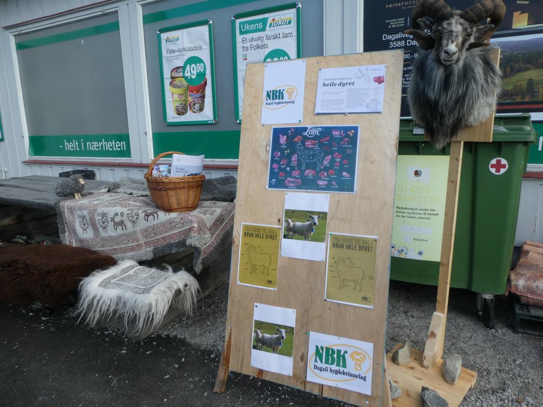Det ble delt ut brosjyrer fra aksjonen til NBK "Bruk hele dyret". Det var mange hyggelige og positive folk ,- hyttefolk og fastboende. Noen fortalte de skulle ha saueskank til middag, eller får i kål eller lammecarré. Det var ikke bare det flotte sauehodet vi hadde med som interesserte folk; Oppdelingsguiden av lam ble studert, det samme ble skinnfellene som var tatt med. Det ble en fin markering utenfor butikken.