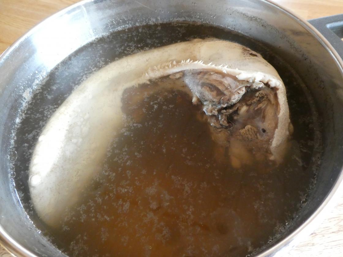 Nå ligger en bog i fryseren og venter. Der ligger også tunga som er kokt. Det hvite skinnet er tatt/ skrelt av.