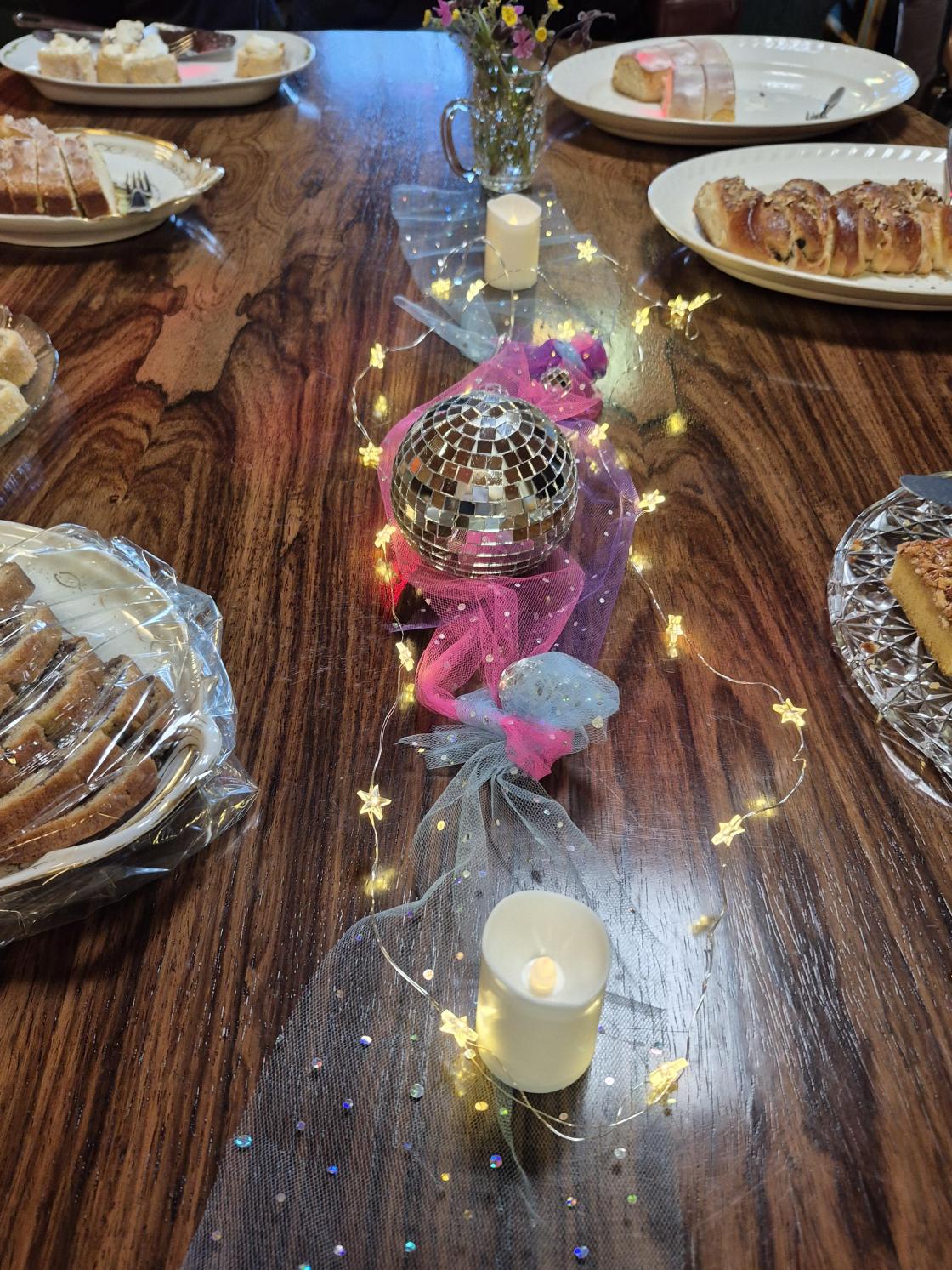 Det var neonfarger på Dølhall denne kvelden. Bygdekvinnene pynta med neonkuler og annet "stæsj" som Frivillighetssentralen lånte ut for å få den rette rammen rundt arrangementet.