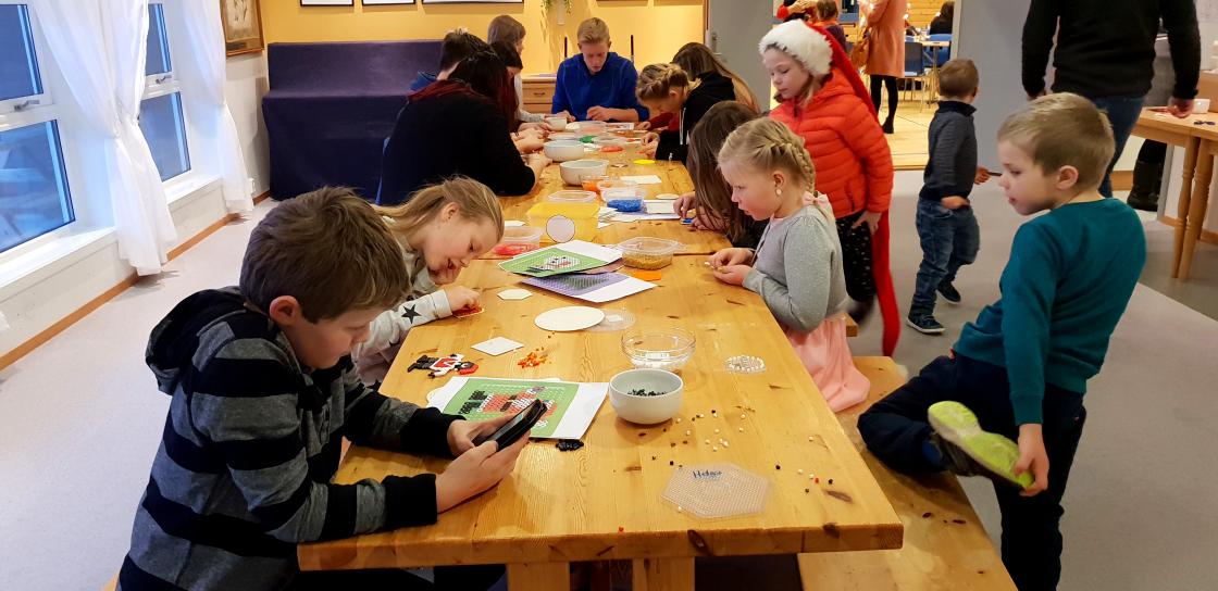 Vi hadde også juleverksted med juletrepynt av nabbiperler. Det samlet både store og små rundt bordet og mye fint ble laget. Julepynten ble hengt på julegrana som vart tent ved vår flotte nærbutikk tilslutt.