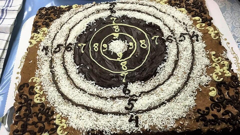 Alle kveldene hadde bygdekvinnelaget også tatt ansvaret for skytterkafèen, og vartet opp med nydelige nystekte vafler og fantastiske kaker. På finalekvelden laget Olga en midt i blinken kake.