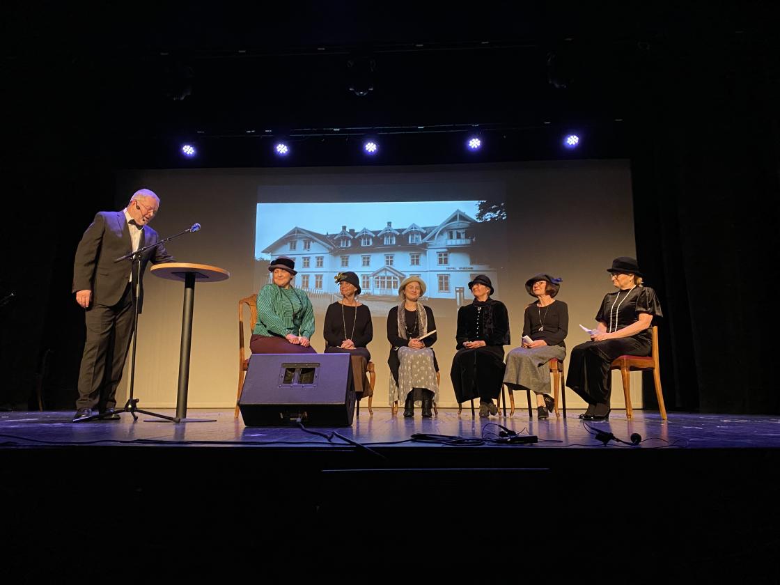Mona Julsrud lokket gjestene inn i salen med vakker kulokk og rundt 200 forventningsfulle gjester fant sine plasser. Vi ble tatt tilbake til 1925 med et tablå fra Generalforsamling i Eidsvoll Landbruksforening det året. Leder Ole Julsrud i Rune Østby Hansens skikkelse ønsket det nystiftede styret i Eidsvoll Kvindelag velkommen. Vi fikk høre alle de seks engasjerte styremedlemmer presentere planer for videre arbeid. Leder Alma Brant, styremedlemmer Lisa Dorr, Astrid Julsrud, Minda Byrud, Hilda Haga og fru Cornelius ble gestaltet av lokale damer.