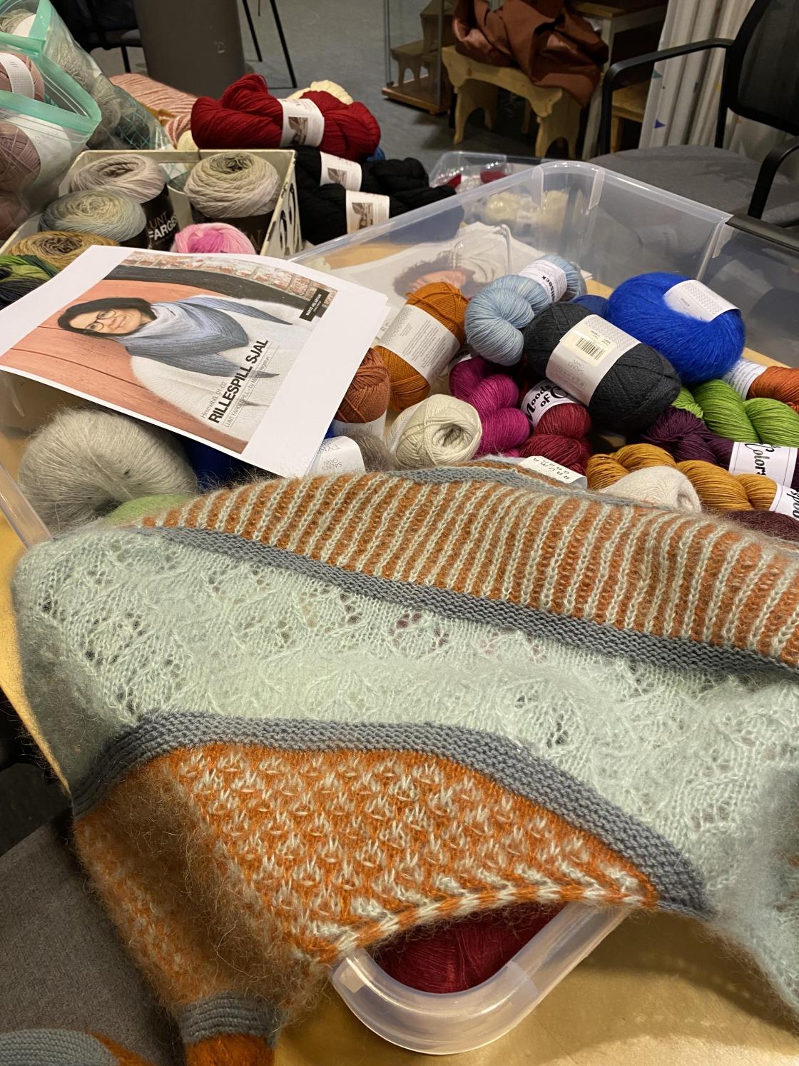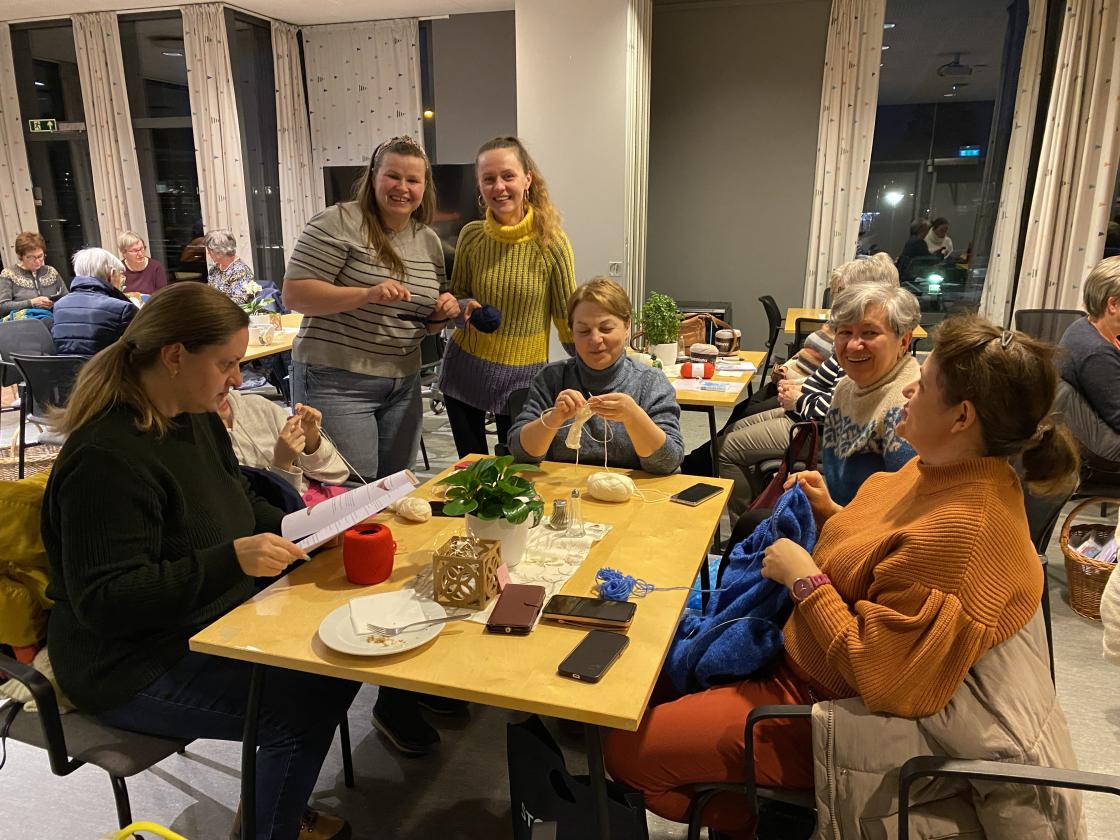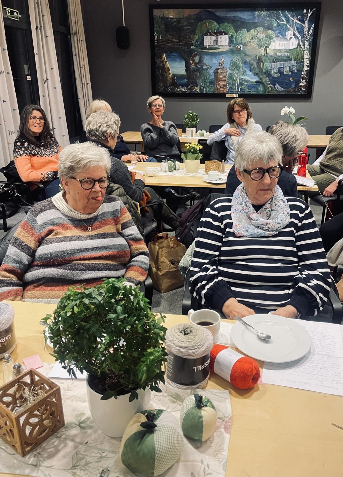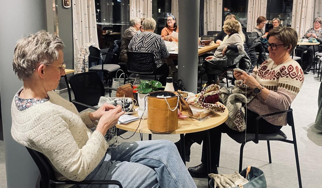 Strikkekafe med fullt hus. I alt 35 hadde tatt turen med og uten strikketøy.🧶