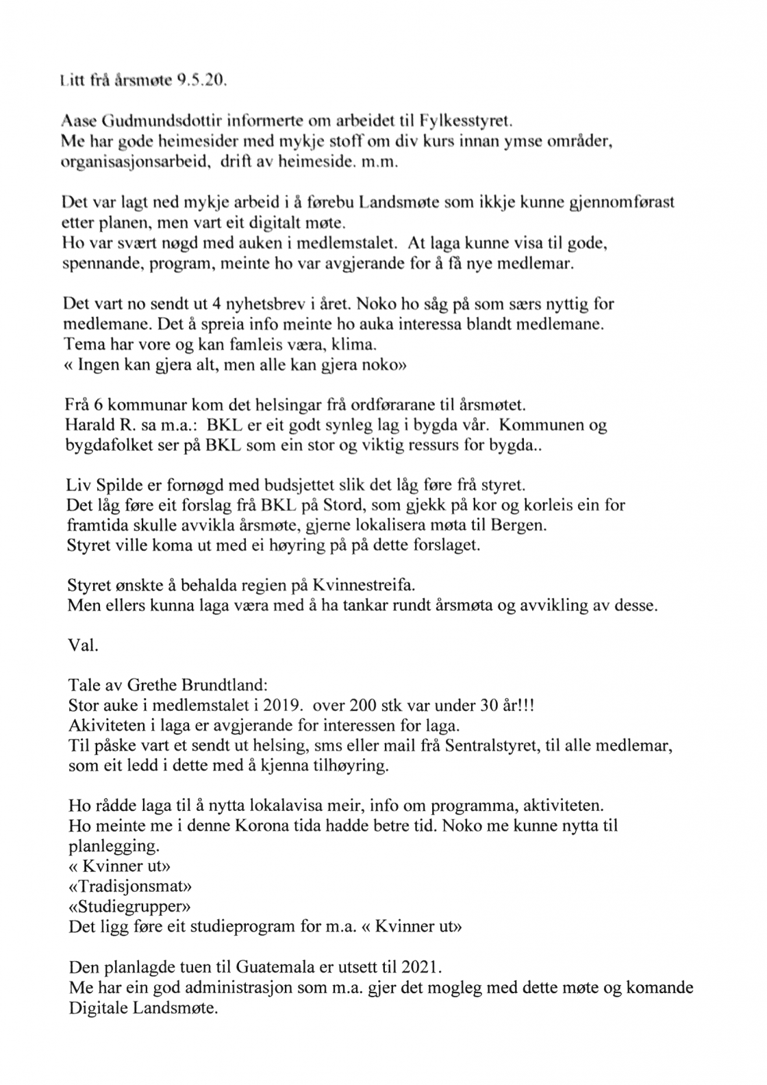 Årsmøte i Hordaland Bygdekvinnelag 9/5 2020