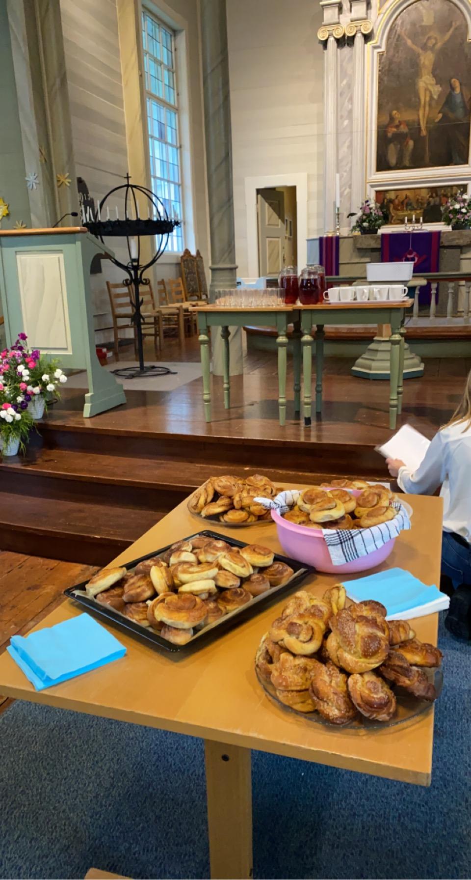 Fitjar Bygdekvinnelag serverer konfirmantene nysteikte kanel boller til konfirmant undervisninga i Fitjar kyrkje.