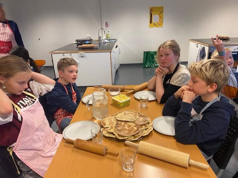 Fitjar Bygdekvinnelag baker med elevane på skulen.